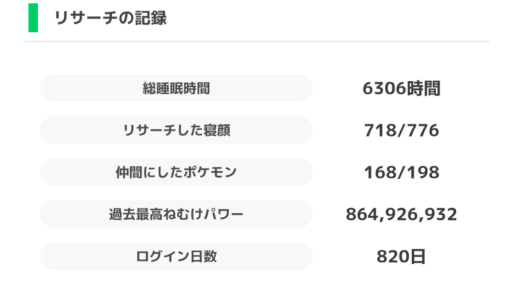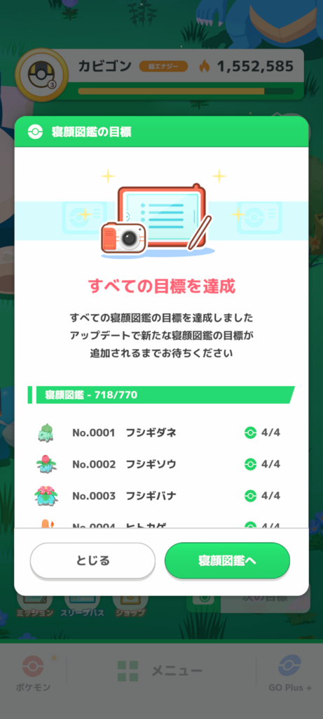 自分は メニュー>プロフィール で寝顔総数776、 フィールド右下>次の目標 で寝顔総数770