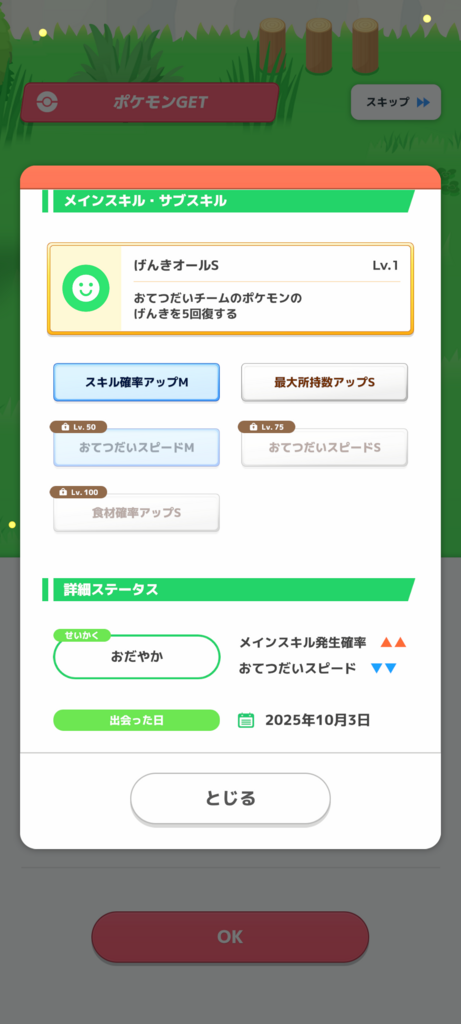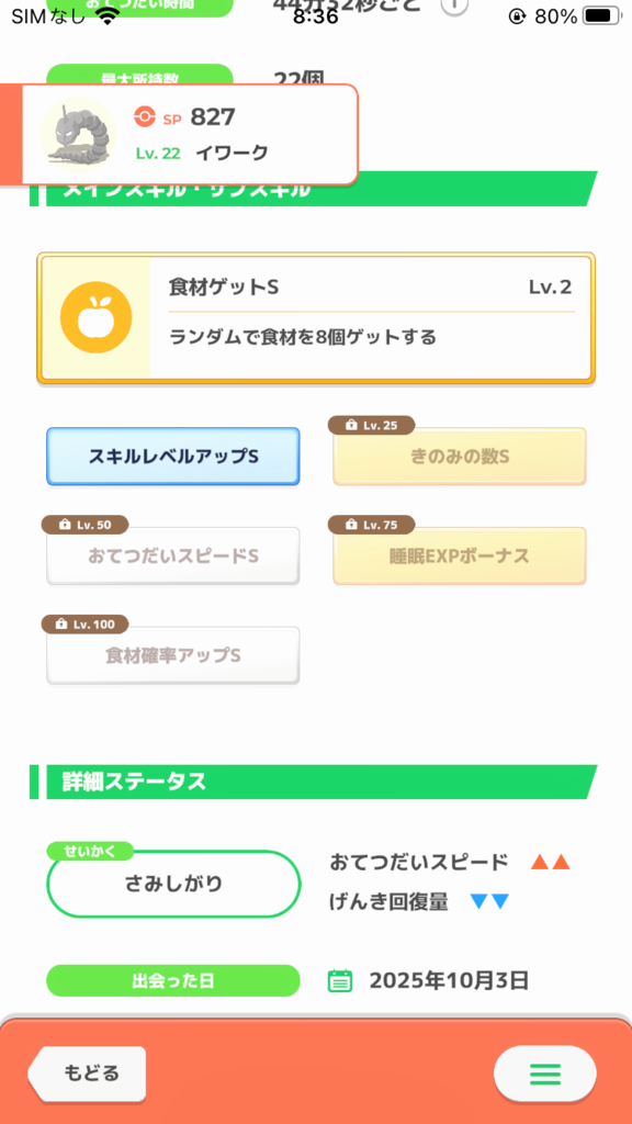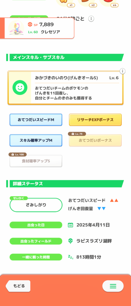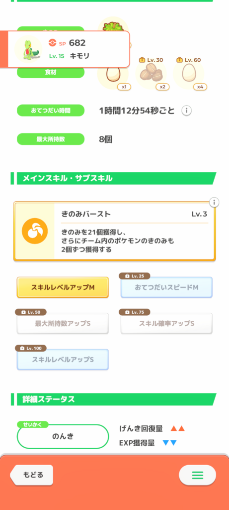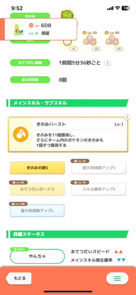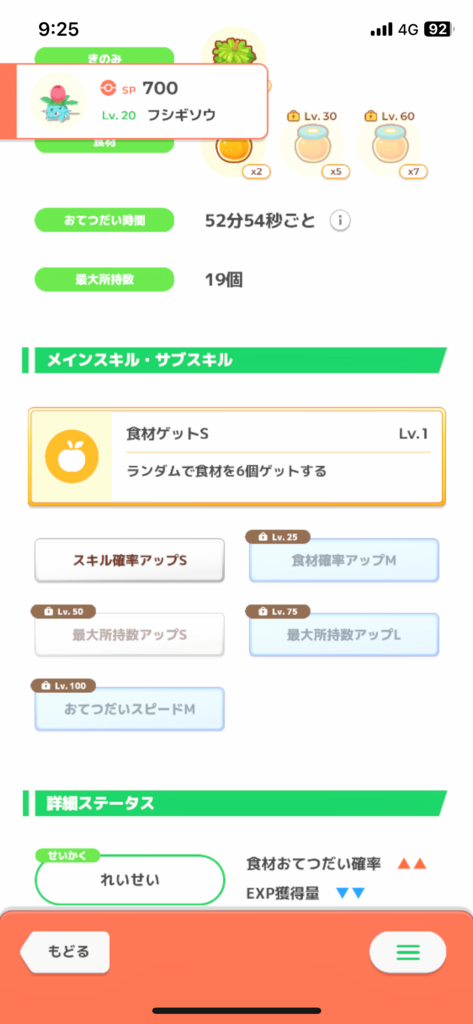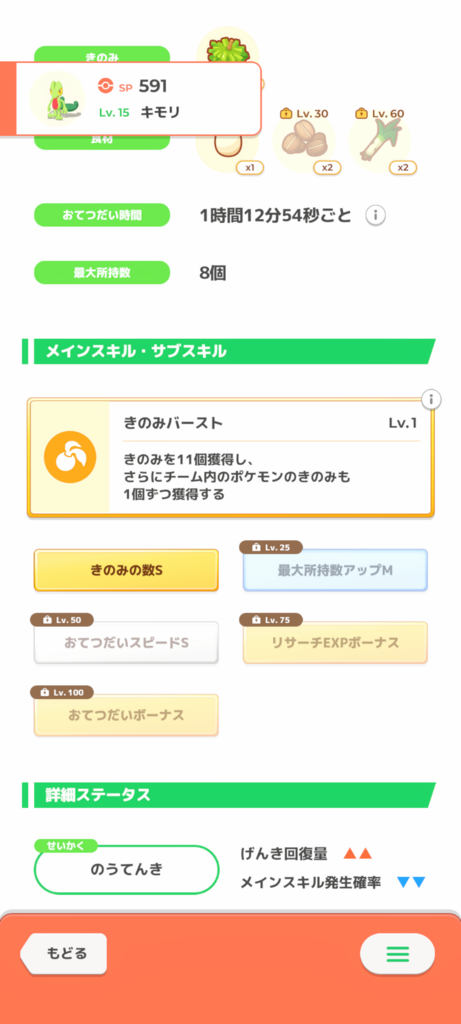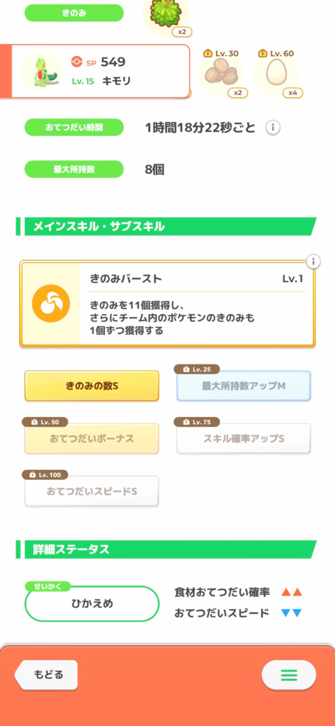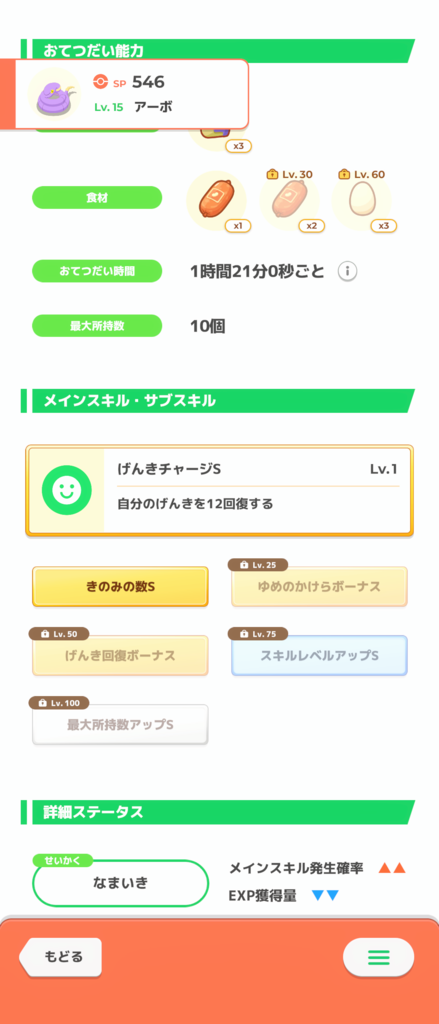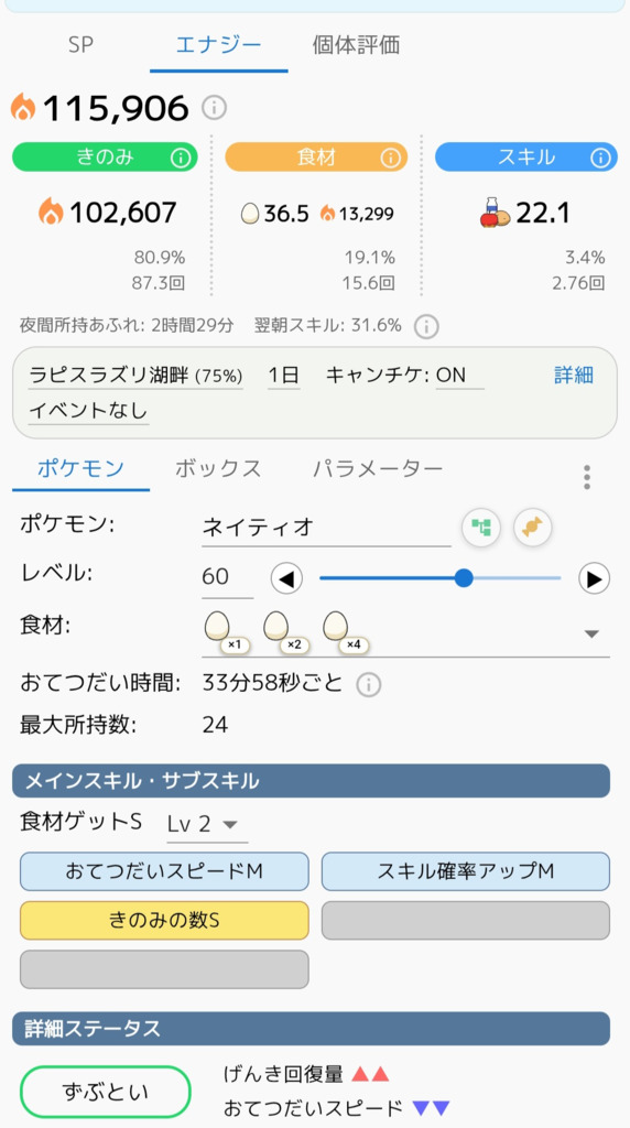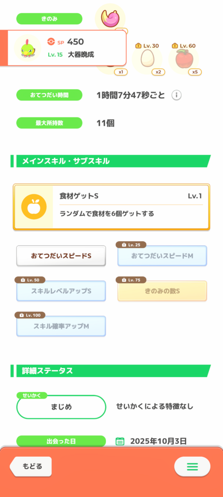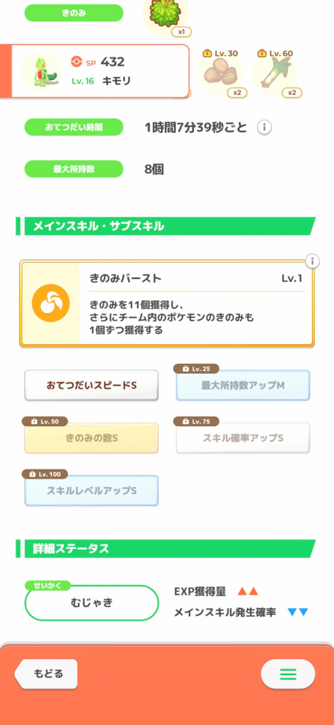稼ぐエナジーがきのみに偏ってる分イベントバフなどの恩恵は低いけど、Lv25に所持数↑がありLv75にスキ確↑が控えていることを考えると相当当たりな方かと個人的には思います。