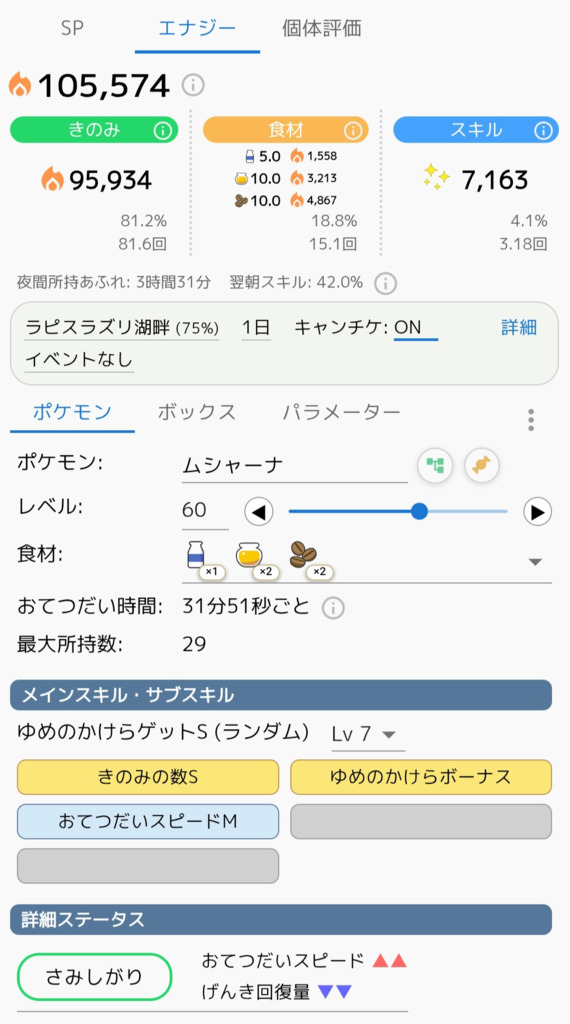 (個人的)理想個体と比べるとLv60/FB75/ラピスで3万弱ほど稼ぐエナジー変わってくるそうですが理想個体なぞそう出るものではなく。。
