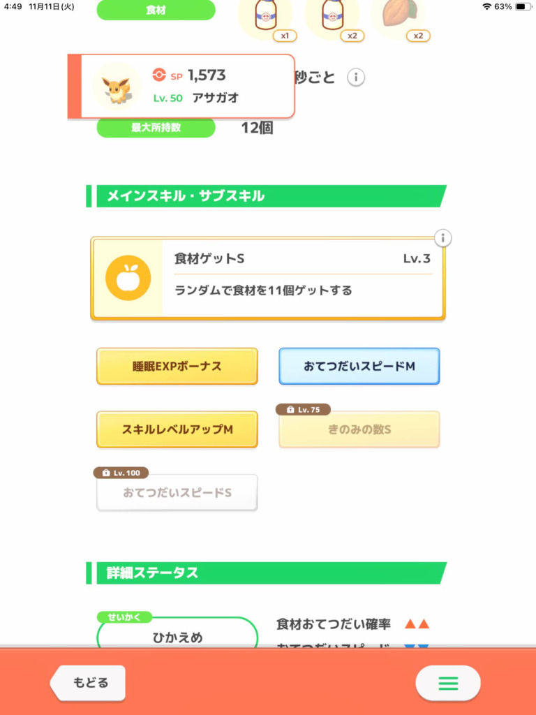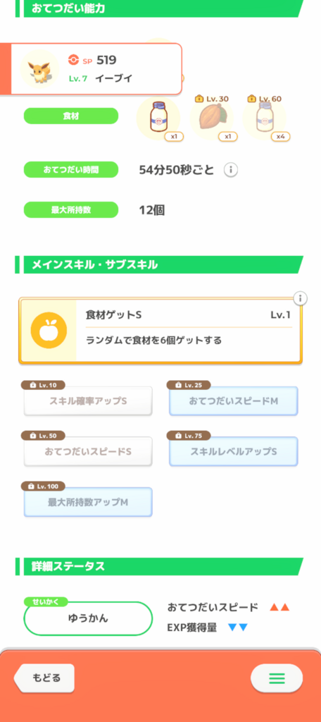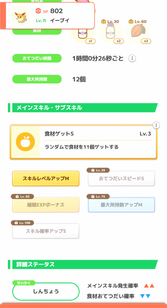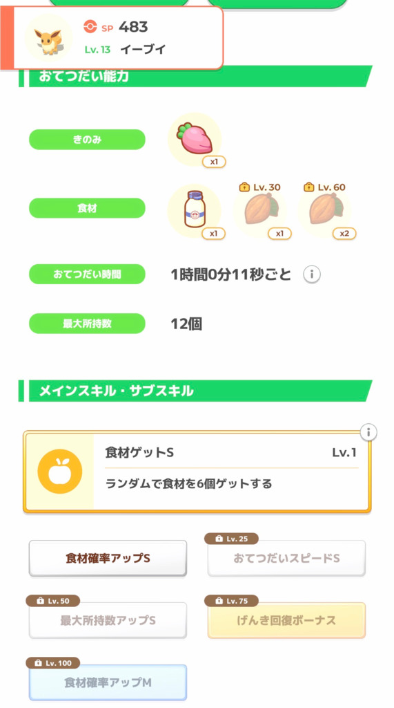 とは言え、スキルが発動しなければきのみ得意や食材得意よりもエナジーを稼げないスキル得意であるにもかかわらず、肝心のスキルは自身のげんきを高く保って自身のおてつだい効率を上げるだけ……という玄人向けの性能である点は変わらないと思うので、その点はよく考慮するのがよさそうです