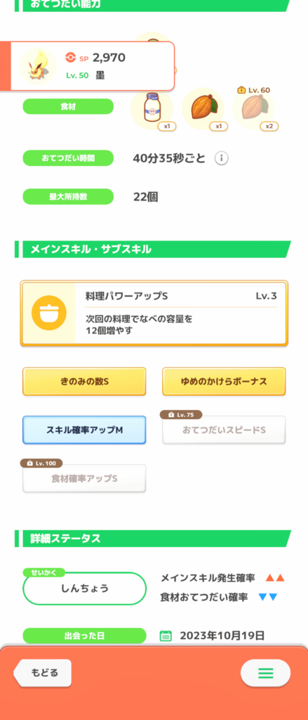 Lv10がきのみSの子を拾ったのですが 25に食材確立s+性格がおっとりで 食材補正がおおいので悩んでいます