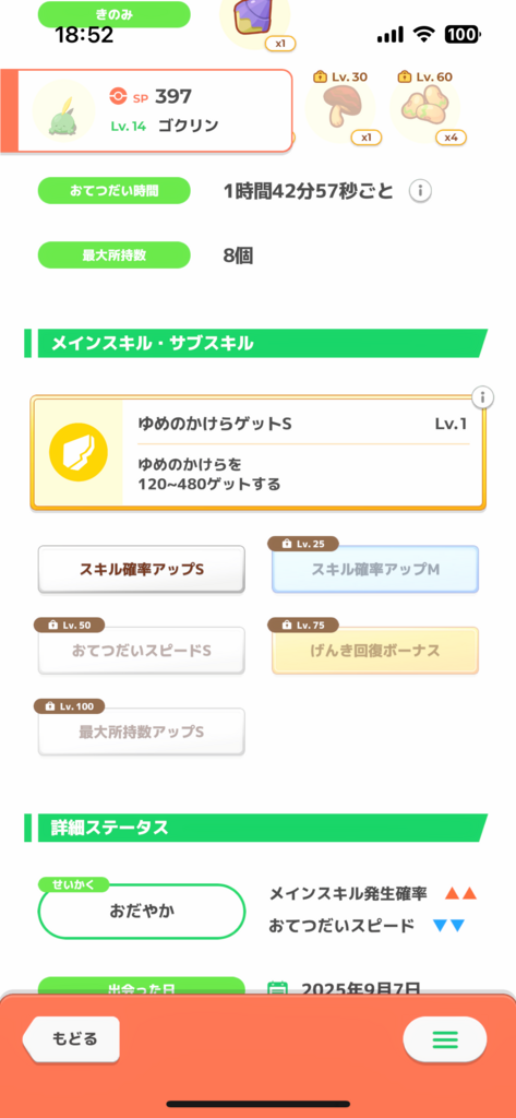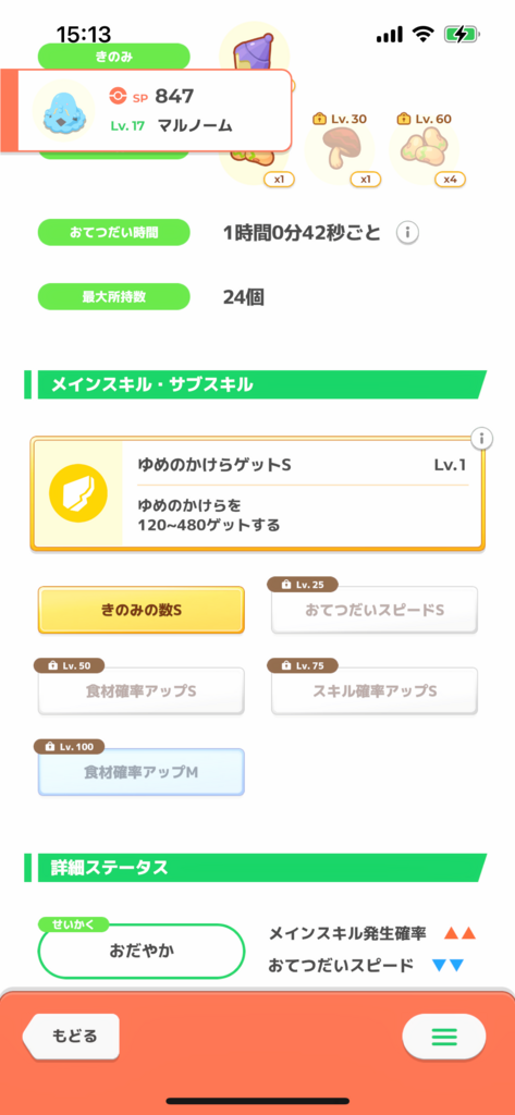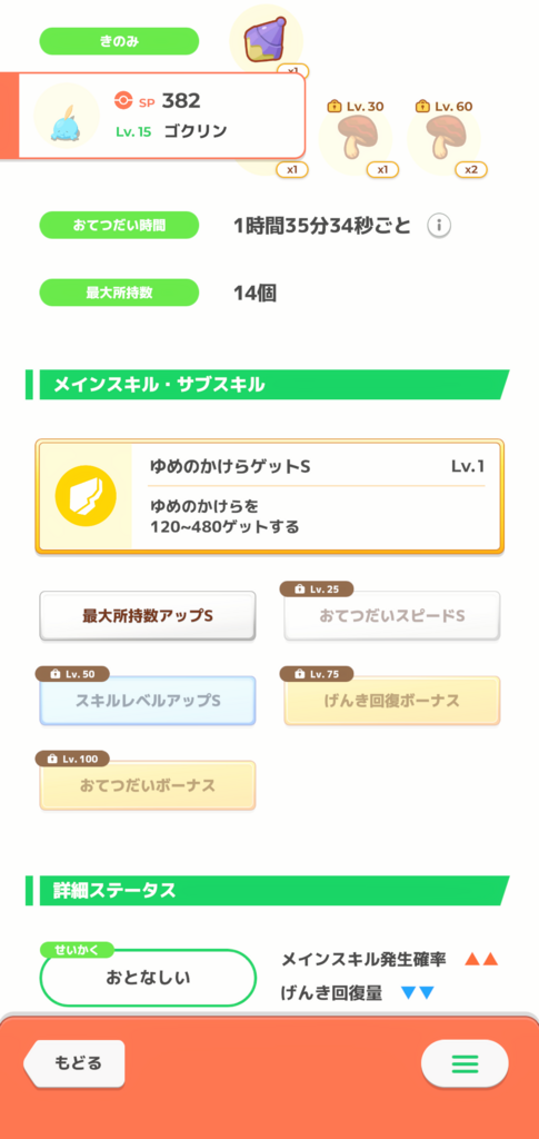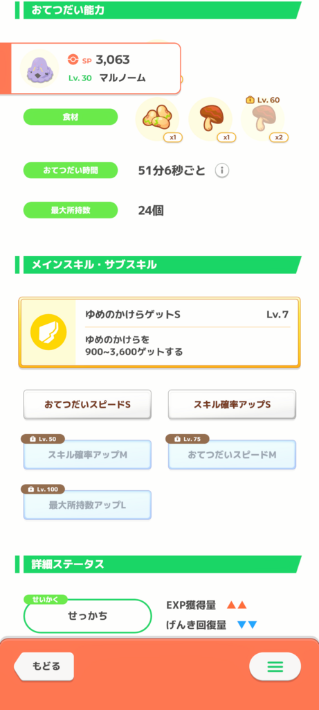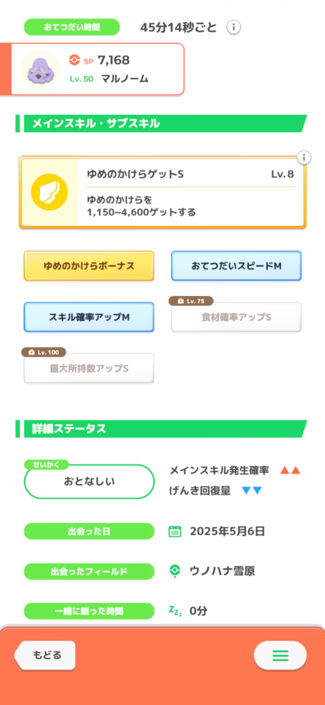 Lv25でスキル発動6.1回/日、サブスキルでせいかくのマイナスを補う、しかもLv50でさらにゆめかけの上積みがある、そして色違い! とてもよい子じゃないですか!!!
