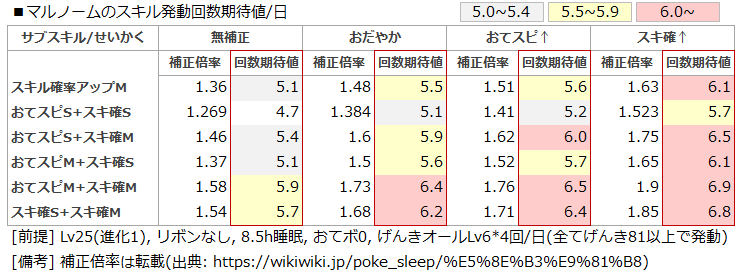 おてスピM、スキル確率Mで性格補正なしのマルノームと1000時間以上寝ています。スキル発動率やゆめかけ稼ぎに不満は無いですが、イベントが無い週のゆめかけ稼ぎに編成する=朝イチ2回発動も狙うから寝かせることになるので、欲を言えば睡眠ボーナス、ゆめかけボーナス持ちだったらもっと利益があったかもなとも思っています。(寝かせる前提であれば)