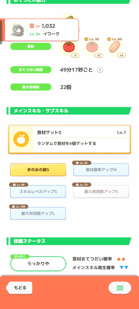 僕の場合はしかも、そこそこの課金勢なので個体採用ラインも上げてます。 きのみタイプは理想は「きのみS+おてスピM(かおてボ)」くらいは欲しい。 厳選って難しいですね~~~しかもイワークはFPが16もいるからもっと厄介(笑)
