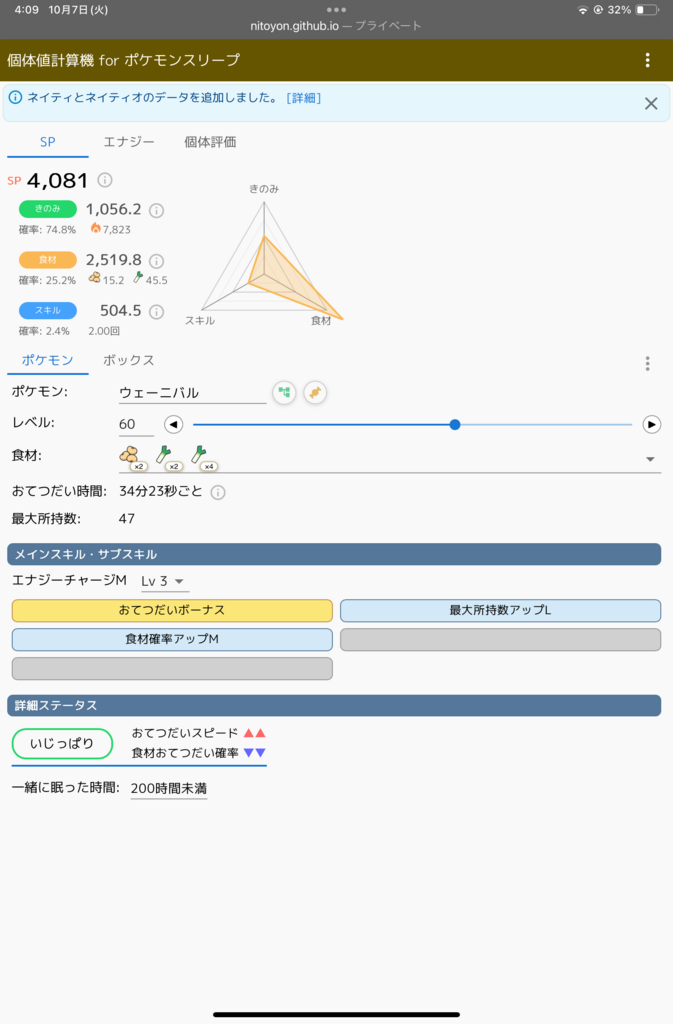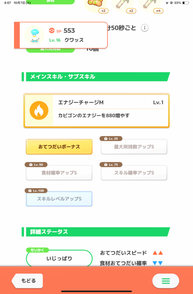 単体の補正で考えると率Mおてボはやや物足りない部類であり、所持数を考慮しない(=短時間のおてつだいの)場合では、ネギの対抗鳥となるカモネギのAA食Mと比較しても1割ほど多いくらいで、このためにLv60までのゆめかけとミントを支払うのはコストが重いと感じます