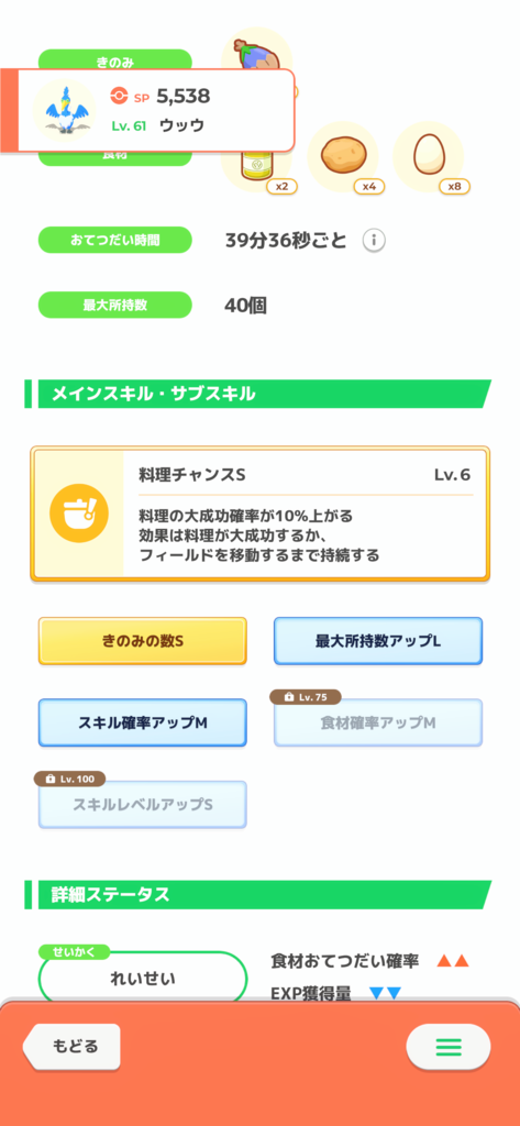 加えて、料理チャンス持ちは複数匹持っていると短時間で大成功確率を上げて大成功を連発したり、料理カテゴリーで使い分けするなどが出来て強力なので、迷わず育成してOKです