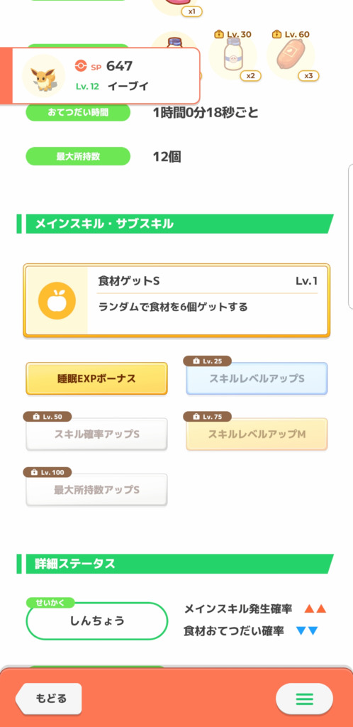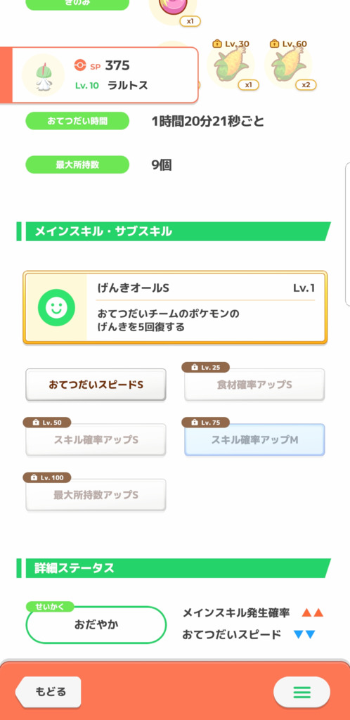 性格のお手スピダウンを気にしているようですがLv10のお手スピSに銀種を使ってMにすれば、お手スピダウンを相殺しプラスにできます。これにより性格でスキル確率20%アップ、お手伝い時間約5.7%短縮とデメリットが無い個体になります こちら参照 良くないとこを言えばLv75にスキル確率Mがある、完璧にするには銀種1と金種1~3は必要なことですね ただLv50時点でスキル確率補正2つにお手スピ↑とスキル発動率はかなり期待できるので、金種1個だけのスキルレベル4でも十分だと思います。もちろんレベルは高ければ高いほどいいです