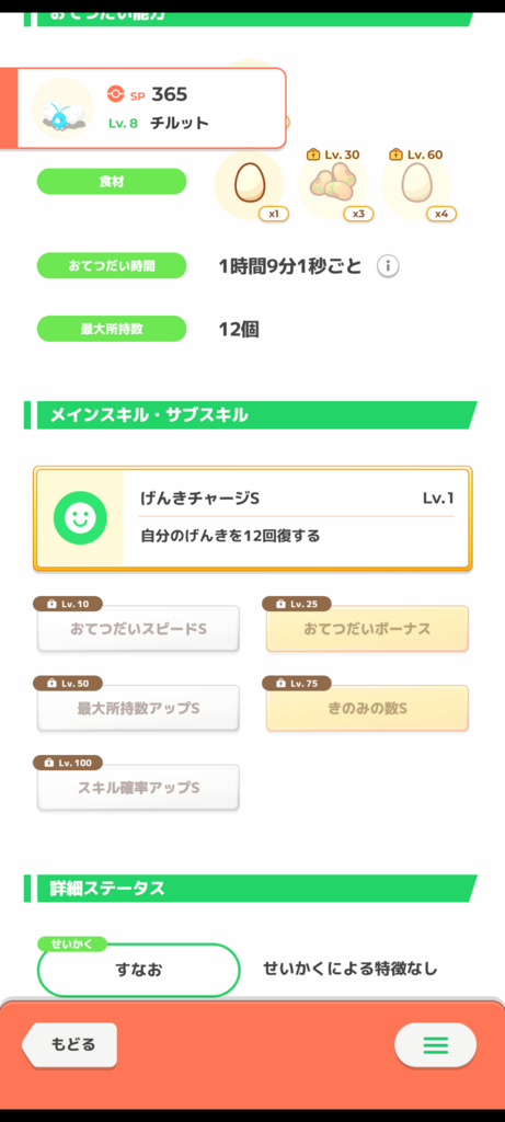 チルット 貴重な卵を拾えるポケモンの1匹です。おてスピ盛り盛りですが欲を言えばきのみタイプにきのみSは前半で欲しいところ…ココと食材の並び以外は優秀と思いました。 進化前はシアンに適性があり、進化後は適性のある様はまだないですがエナジーの高いヤチェでカイリュー系統とチルタリスのみと貴重です。 ですが、きのみSチルタリスでもスペックの高いきのみSカイリューにきのみエナジー同じくらい稼がれるのでどこを見据えるか次第ですが厳選するならハードルは高く設定する、又はこの子をとっても気長に育成をするのどちらかかなと思いました。