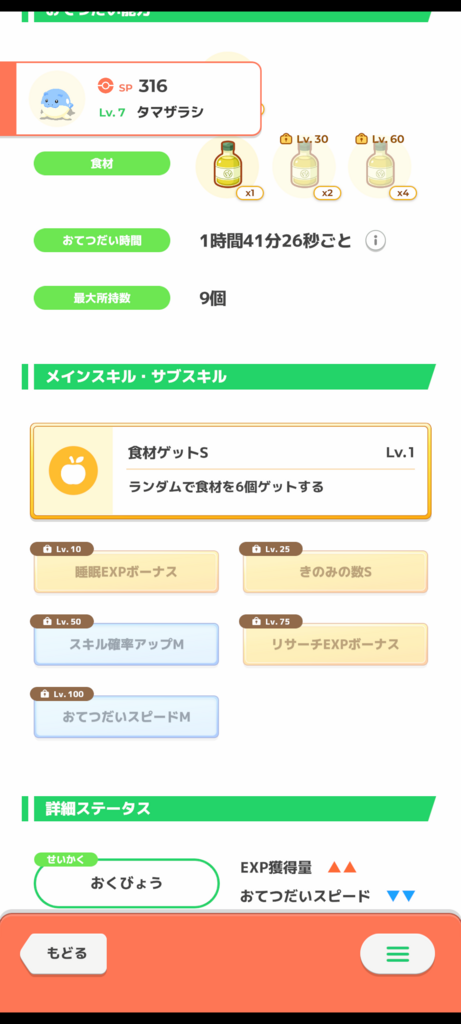 貴重な卵を拾えるポケモンの1匹です。おてスピ盛り盛りですが欲を言えばきのみタイプにきのみSは前半で欲しいところ…ココと食材の並び以外は優秀と思いました。