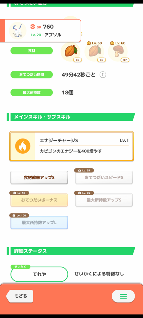 所持数増えるサブスキルがないと頻繁に触らないと溢れがちです。カカオ自体は料理で出番が多く、基礎エナジーも低くないので悪くないですが、カメックス等の競合も多いです。自分の場合はブイズとカメックスでカカオは足りてると感じてるので所持数のないアブソルは見送るかな、と思いました。