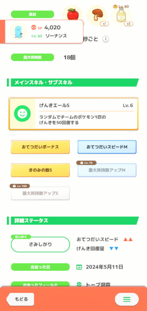 ソーナンスは素のきのみ効率は本来最低ランクながら、きのみSとおてスピ補正乗りまくってる上、後述のやけに多いアメのおかげで高レベルにスッとでき、きのみエナジーをボチボチ稼いでくれている。