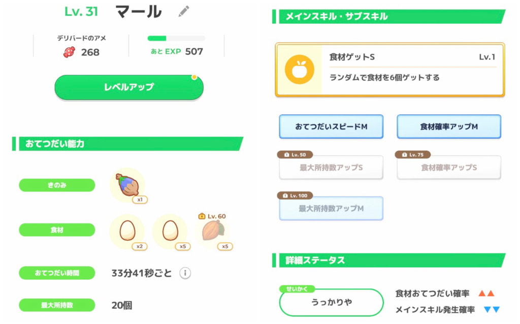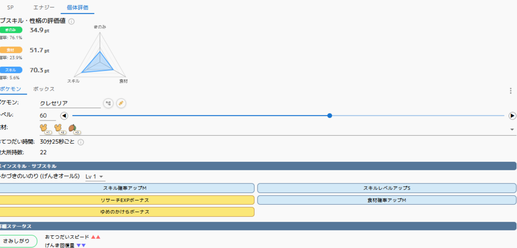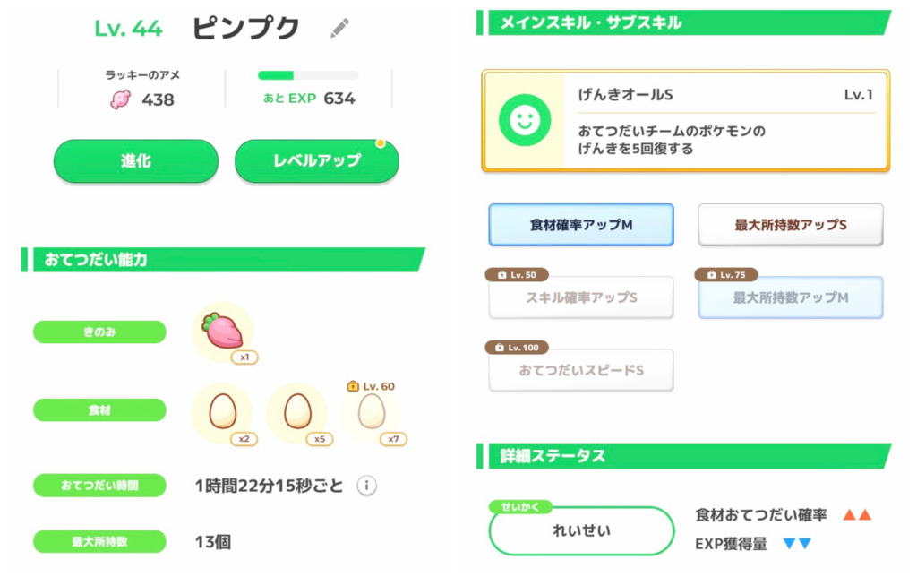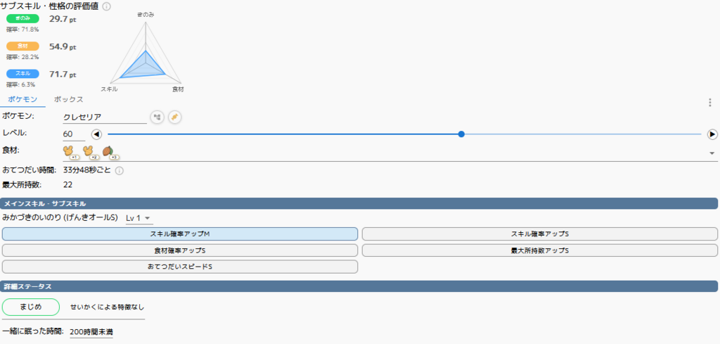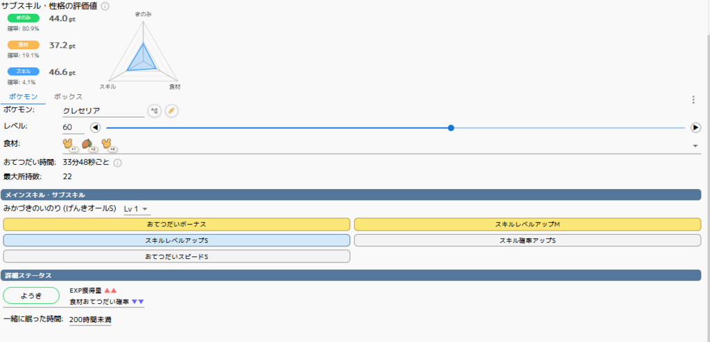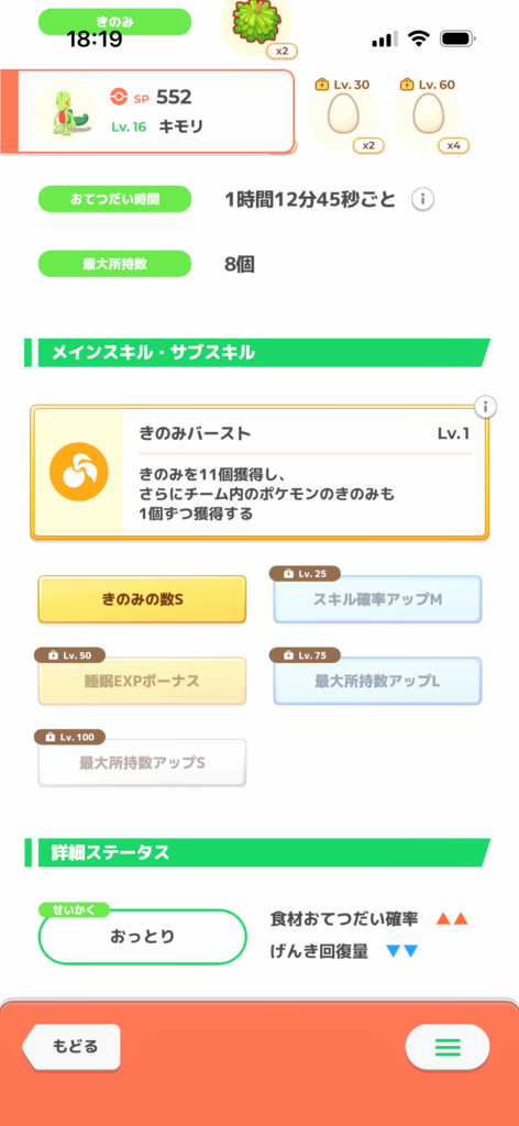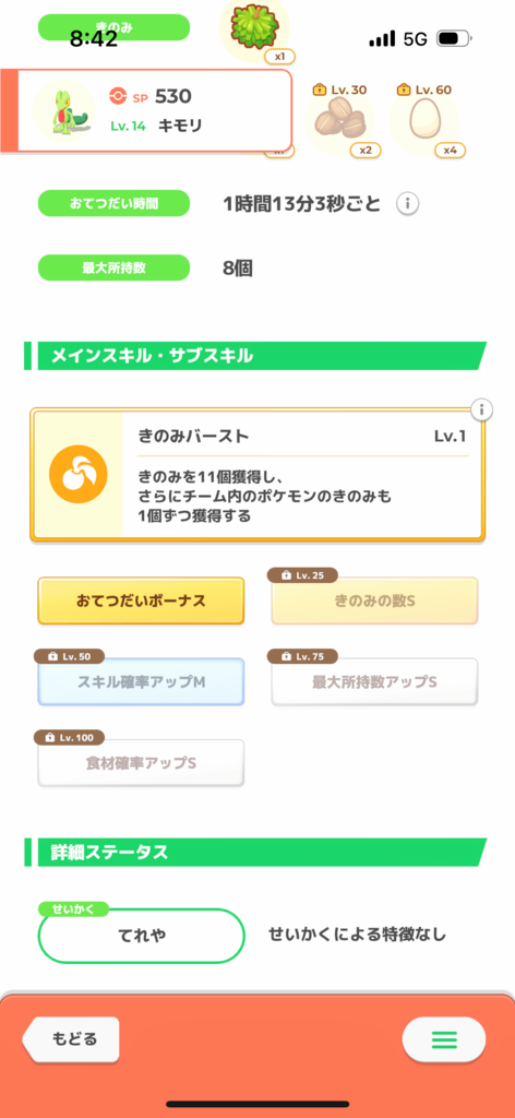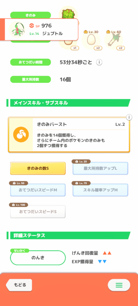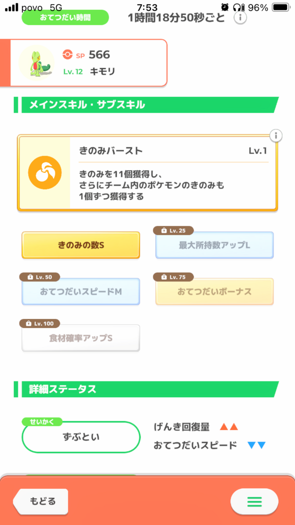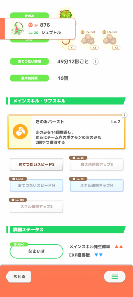 性格のおかげで無補正よりはほんの少しいい点が幸いですが、サブスキルに突出したものはなく無補正きのみSに近い個体です。