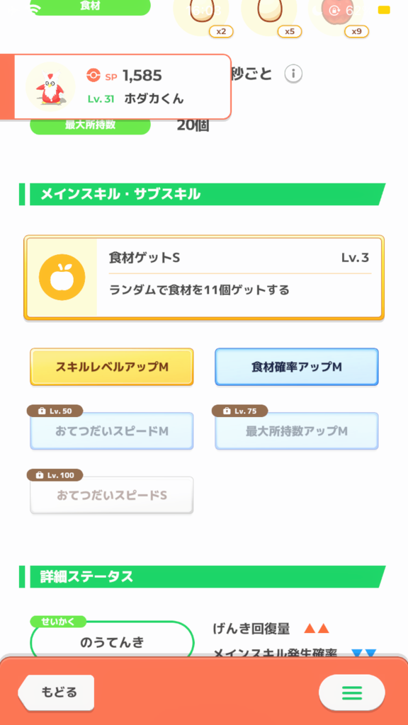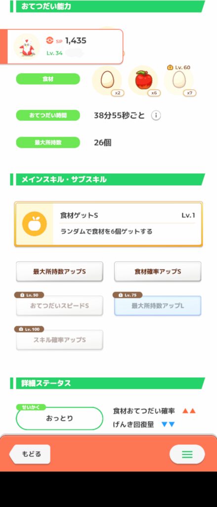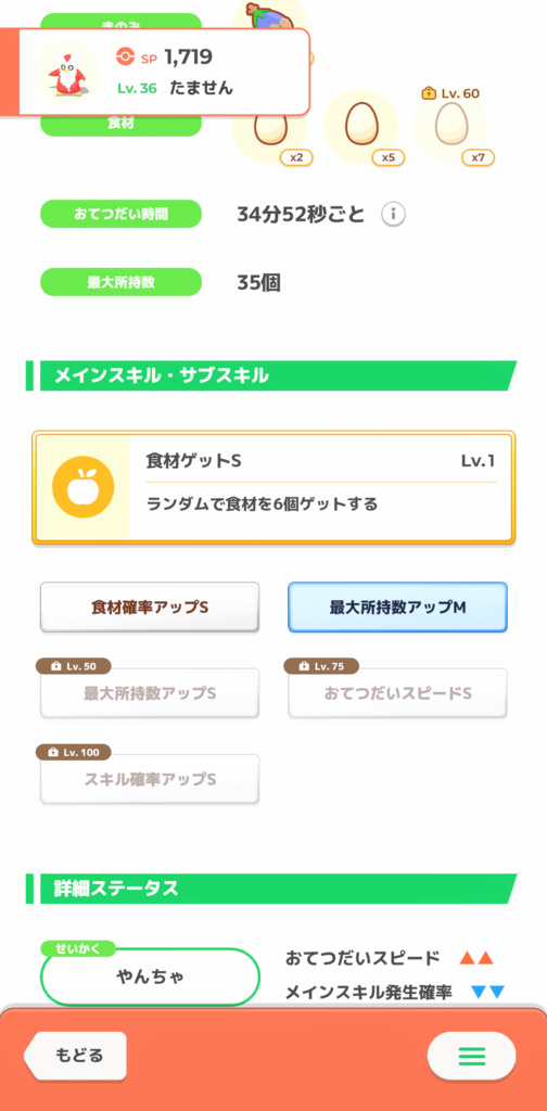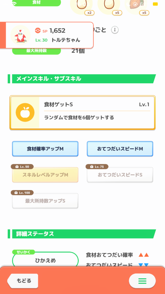 悲しみの性格なのですがこのサブスキル構成ならいける! と突き進んで育てた弊キャンプの卵担当です。 50レベルの現状でもキャンチケ切ればマカロン3食なんとか回せますし、60になればチケなしでもいけるはず。性格の不利を乗り越えた子だと思うとかわいさもひとしおです(親バカ)。