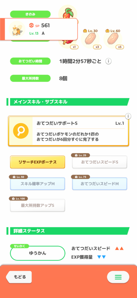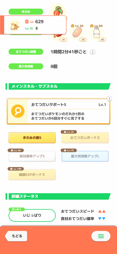 とくに、非適性のポケモンがまだLv30前後と十分に育っていないときは、そちらよりも適性ポケモンのおてつだい貯蓄を高めるほうが大分効果的なので、貯蓄加速のために編成する意味合いが大きくなりそうだと感じますね〜