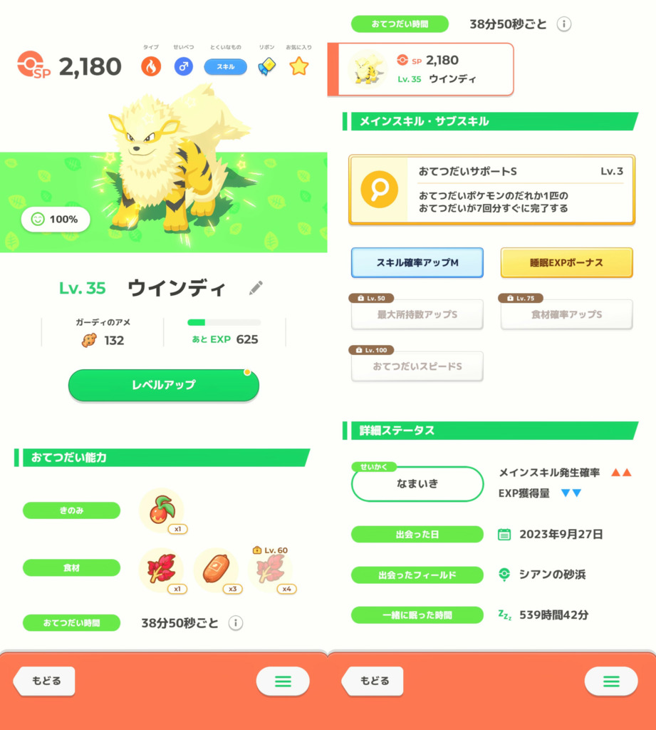 昨晩しっくり来る週跨ぎが組めずにいたところ思い立ちガーディを投入しました お手ブ5匹効果を期待できるうえ手持ちでは貴重な睡眠EXP持ちということで、アメ約2個分の育成も進むのはかなり良さそうです アイテム進化への嘆きの声もありますが、格安で金種を売ってくれると考えると悪くないと最近は思えるようになりました。使えば朝イチ発動期待値も5割から8割まで上がるそうです お手サポは最高性能のエルレイドと決めていたのを覆す能力を感じさせますが食材量は並なのが絶妙ですね 食M含む青サブスキル個体などいれば育成してみてもいいんじゃないでしょうか