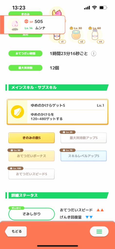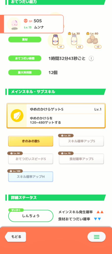 やっと一体目を仲間にしました。 きのみスキル中心のタイプなら、食材確率アップSが控えてるのがちょっとマイナスな気はしますが、それ以外はわりといい感じでしょうか? イベントまでにどれだけ育てられるか……。