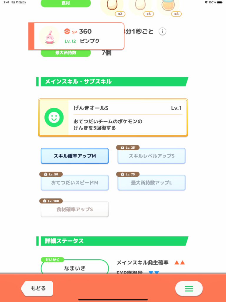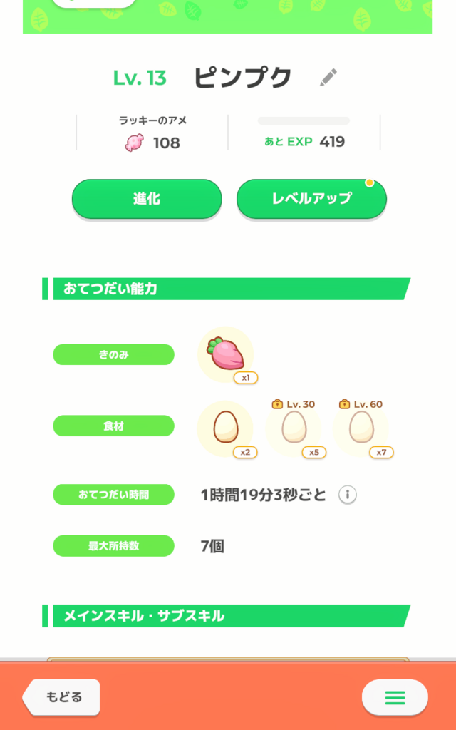 ABCピンプクでしたが食材確率Sの性格無補正、思い切って進化させてみたら最大所持数とお手伝い時間がアップしました😆