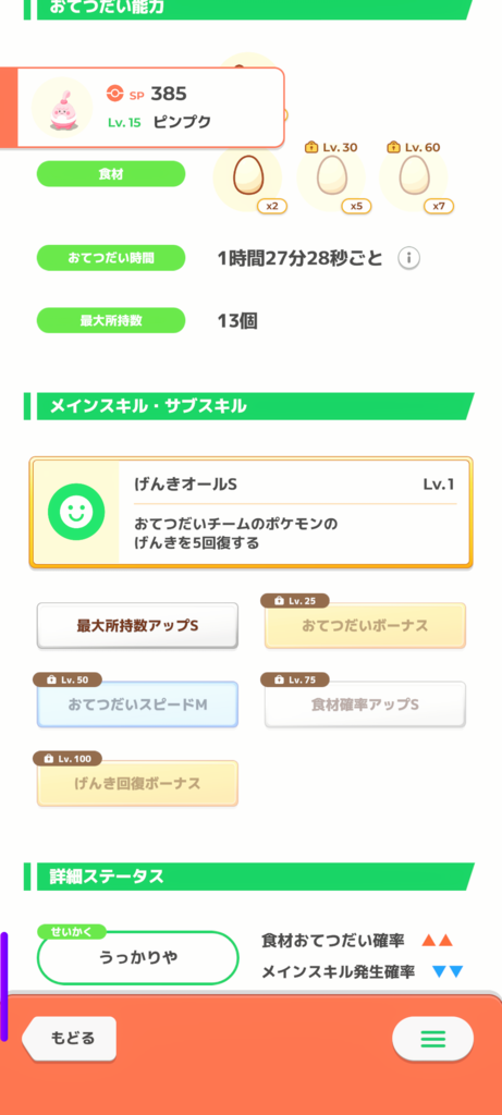 ABCピンプクでしたが食材確率Sの性格無補正、思い切って進化させてみたら最大所持数とお手伝い時間がアップしました😆 もう一匹はABAですが性格ずぶとい(お手伝いスピード↓)のサブスキルでも補正不可のようなので、卵要員としては辛いところ。ごめんよ、スキレベS持ちだけど新しくAA個体なんか来ちゃったら浮気確定かも。