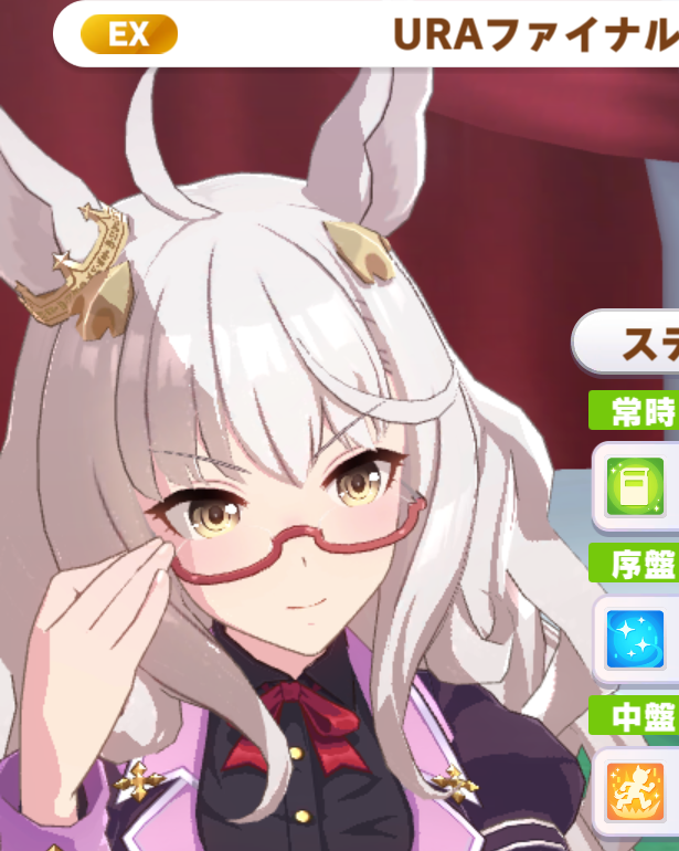 メガネっ娘。耳飾りの濃いor暗い色の方と同色のフレームのハーフリムの眼鏡で全員共通している 形はビワハヤヒデのと似てるが彼女のはアンダーリム【参考画像】なので流用では無いっぽい