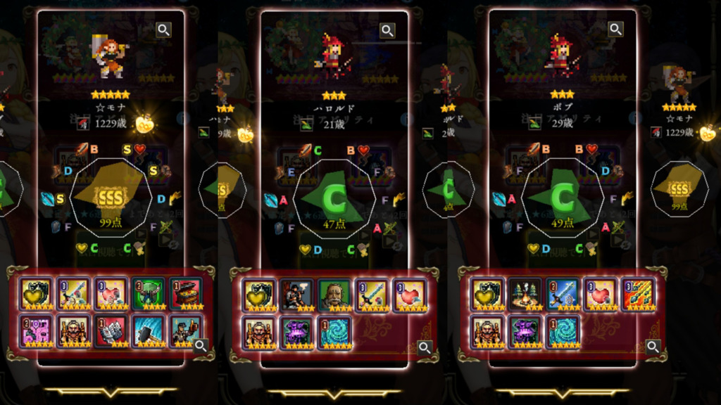 何が言いたいのか伝えきれない所もありますが「強いキャラを並べつつ全攻略コンテンツで最適解でなくてもベターな感じで兵士ガチャの不安定さや役割被りみたいな無駄なく編成をしたいけどこれどうですか?」みたいな感じです。