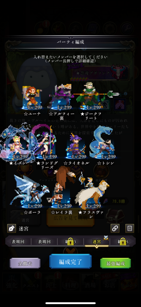 取り敢えず私の構築でも 意外と大きいのは「神・幻兵士雇用ボーナス」で、高スコア目指す時は確定契約を利用、40人程まで神・幻だけ契約→残りをアンロックして確定契約としています 一応確定契約無しでも100万(EX宝石の最大倍率)行ける時は行けるのですが…かなり運が絡みますね かといって全兵士を毎回確定契約しようとすると、ジェムが貯まらなくなるので…雪嶺禁断AFはやっぱり助かる