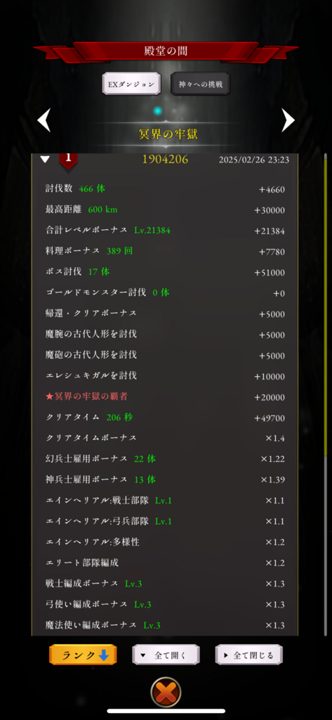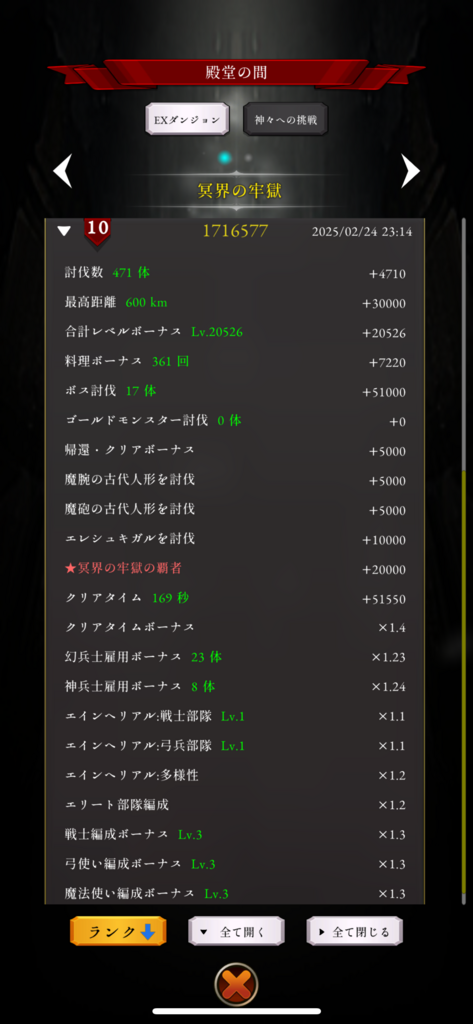 運が絡む要素を除けば主にエインヘリアルの編成と、あと兵士の確定排出くらいしか盛れませんね…… 後は兵士の合計レベルと料理回数くらい? こちらは割と自然とやってるかと。