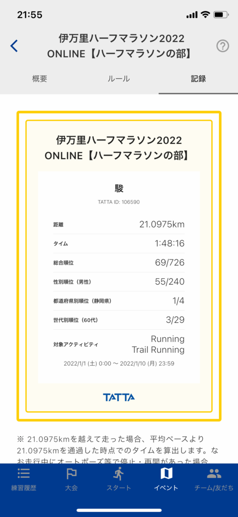 今年の走行距離は 1月100km 2月45km(伊豆フォトロゲ) 3月23km(沼津10km) 4月22km 5月44km 6月50km 7月52km 8月61km 9月45km 10月85km(TATTA42km) 11月70km(こまつ42km) 12月70km(福島42km) 年間計667km てな感じでした。 後半リモート大会に3つ参加しましたが リモートはもういいかな~ TATTAは無料のタイムアタックがあるので それで満足な感じです。 来年あたりはロードレースもちょぼちょぼ再開されることを願って 少しずつ参加したいです。 皆様、トピにお付き合いありがとうございました。 また来年もよろしくお願いいたします。 ではよいお年を!