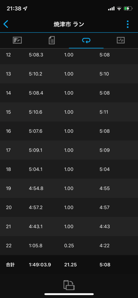 ハーフやってきました。 風も弱めで天気も良く 走りやすいかな?と14時からリバティに向かい 走って来たんですが・・・・ ラップみていただけるとわかるんですがちょっと入れ込みすぎまして(苦笑) あと、この天気で何を着ていくか・・・ レースだと絶対に短パン、半Tで行くんですが 汗冷えすると嫌だなぁ・・・ あと、短パンは寒いよなぁってなわけで CW-Xのタイツと長袖Tシャツ 中にメッシュのノースリーブのインナーを着ていました。 で、冬用のグローブをして行ったわけですが、まず3キロであまりの暑さでダウン(苦笑) Tシャツの胸が汗でグッチョリ(苦笑) 手も暑くてグローブを脱いで走ったわけですが その後もときどき休みをとって なんとか走り終えました。 リバティのラスト周辺で 距離を間違えていたことに気づき500m戻って 往復で1キロを増やしましたが(苦笑) あれで気づかずにボタンをポチッと押して保存しちゃったら もう一度 やり直しでした(苦笑) やばかった・・・・。 後半は、ストライドも出来るだけ延ばさず 淡々とトコトコと走ってきました。 の割に、タイムは良いタイム出ていますが 正直 よくわかりません。 あれであのタイム?とか思いますし思ってるより遅いときもあるし。 まっ、とりあえず懸案事項終了です。 年末から気が重かったんですよね(^^;)
