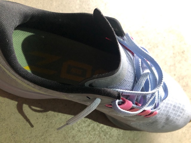 靴(ズームフライ3)確認しました。 タンが柔らかいです。 茶民さんの言う靴袋 意味分かりました。 なるほど^^ と言う感じです。 履いてみて当たりがどうか?ですよね。 靴紐をガチガチに締める方なのと鈍いらしくて履いて10キロくらい走って やっと気づく点が多いので楽しみにします^^ ペガサス37のタンの部分とズームフライ3のタンの部分 写真を貼っておきますので次期主力戦闘機にお考えの方はご参考になさってください。 オレンジがズームフライ3、淡いブルー?がペガサスです。 タンの部分の凹の形状が分かると思います。 薄いんですが意外と芯が硬いです。 これが足首に刺さります(^_^;