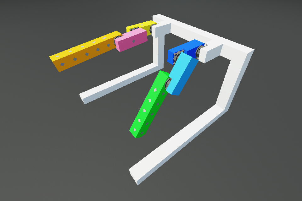 画像アップロードテストも兼ねて重量によるピボットの強さについて説明。各マージ毎に色分けし、奥側のみ重量ブロックを設置。青水ピボットは折れ、黄桃ピボットは若干曲がっている。