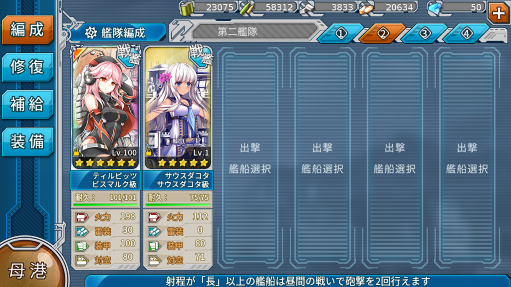 今試験的に2-4-Hマスに行ったら特殊編成艦隊と偶然遭遇戦になりましたが、索敵値の関係で低レベルの艦隊でしたがS勝利出来ましたよ・・・ それとティルピッツとサウスダコタは同一艦隊に編成出来ますよ。