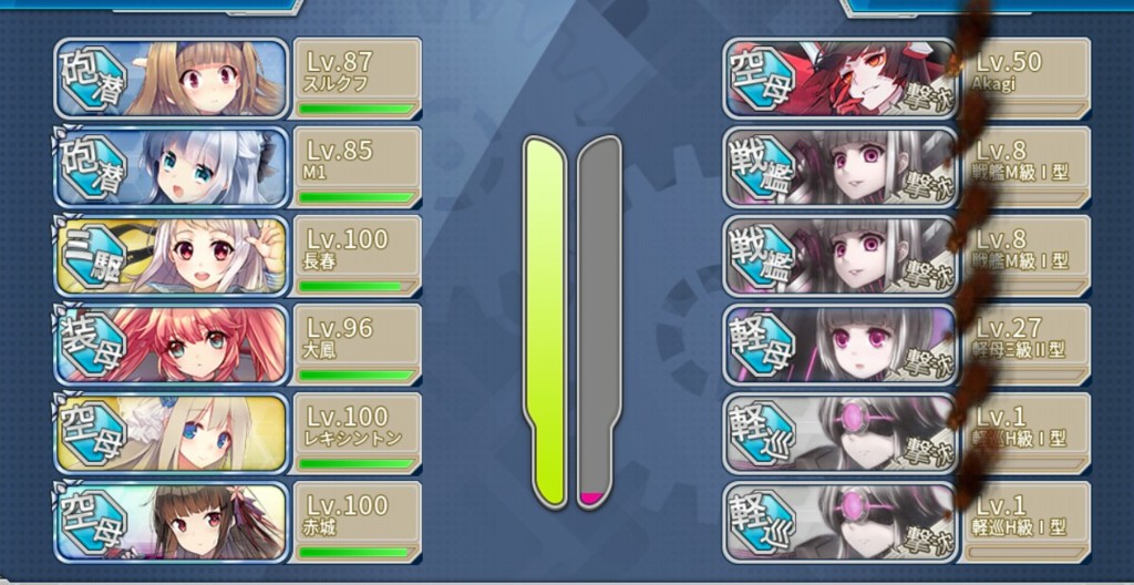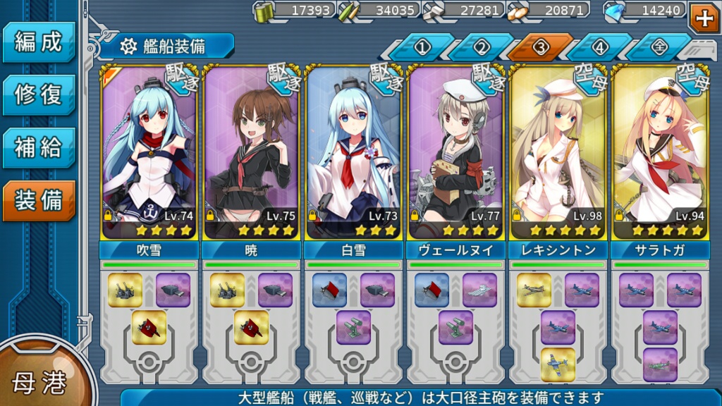 こちら、編成とレベルと装備になっております スキルレベルは吹雪白雪がLV3、ヴェルヌイと暁がLV1、レキシントンLV2でSRTGが...0です(真実) 能力強化は全員MAXだゾ