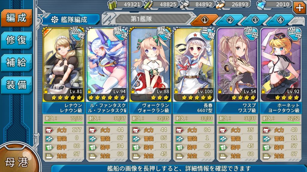 6-1-CFIで掘りを始めてやっとU47とソーマレズが来ましたが、この艦隊編成で索敵値クリアして中大破艦も少なく掘りが出来ました。動画ではまだドロップしてませんがヴォークランの大型駆逐艦のスキルが長春にも作用しているみたいで光りますよ。