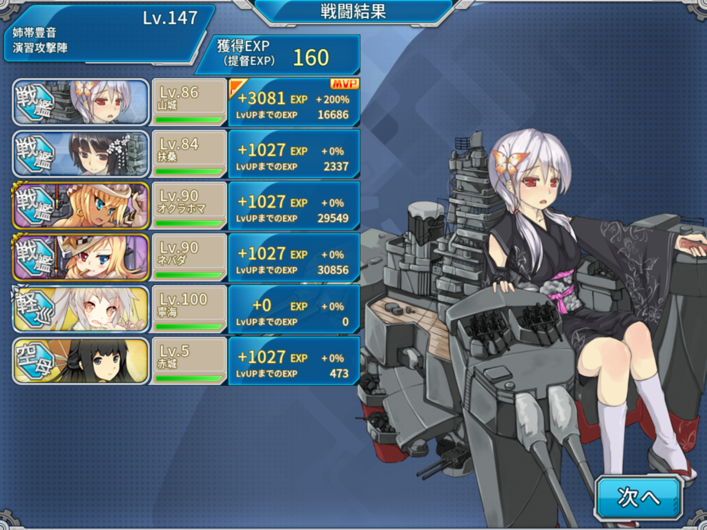 ちなみに軽空母Lv100*6と戦ってSS勝利だと、普通は経験値960だよ。