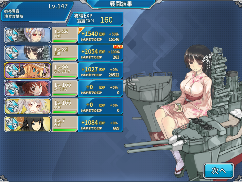 MVP取得と好感度経験値は関係ないって書いたよね。戦闘機を多めにする、武器のランクを下げる、キーロフ砲を積まない、徹甲弾・超重量弾を積まないなど、Lv100の旗艦はMVP回避をしてね。