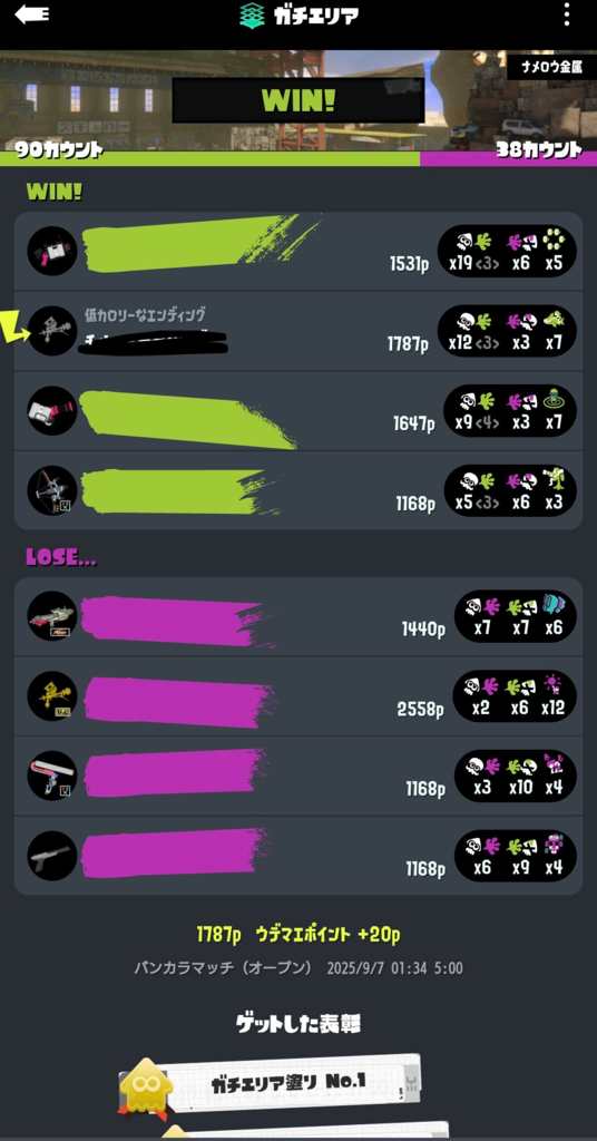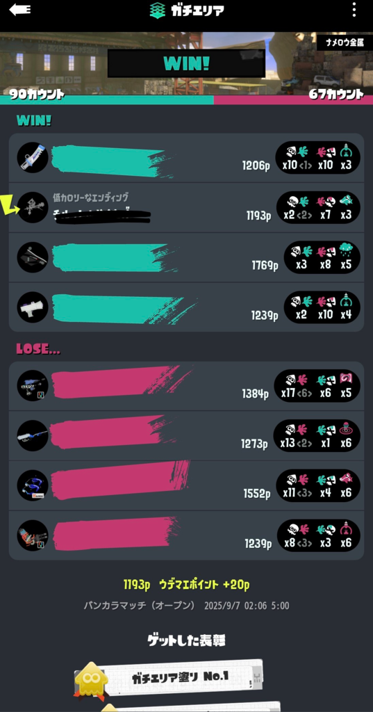 この試合マジでスプラトゥーン過ぎる デンパがゾンビで突っ込むかバリアでこじ開けた隙にモデの炭酸2個投げサメか、ボム2個わかバリアか、オフロのスプリンクラーアメフラシかでその時塗れる人がとにかくエリア塗り続けて勝ち。 ステと編成的にキル勝ち不可能と判断して最初から最後までキル狙わず塗ることだけを考えての逃げ切り。 多分味方の立ち回り的にも同じような思考だったと思う。 全員で対面拒否してルール関与で勝ち切るぞ!って意思を野良で完璧に共有出来たの初めてで楽しかった。 こんだけキル負けしても塗りで逃げ切れるのマジでスプラって感じ。