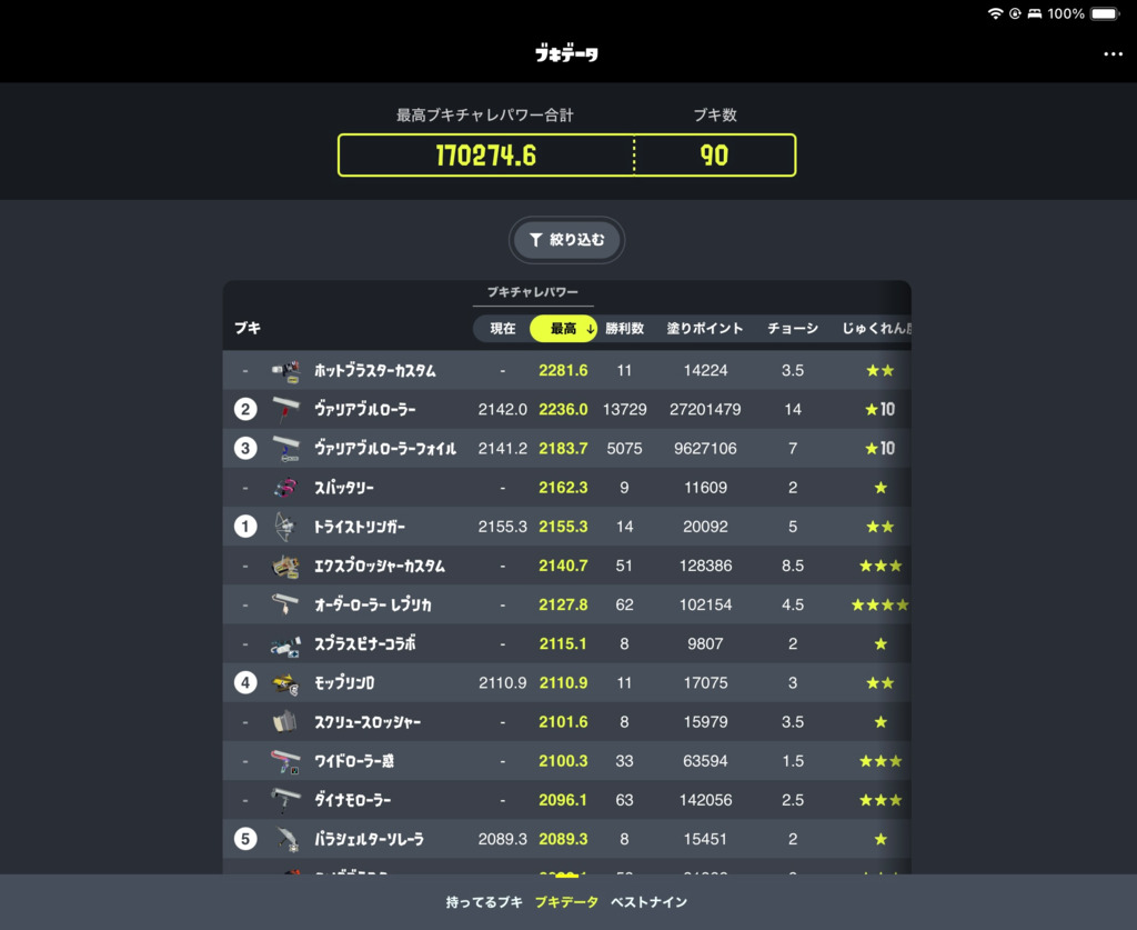 90ブキ計測完了! ところで今シーズン始まった直後に、シーズン改めてブキチャレパワー計測すると前シーズンの最高値が今シーズンの最高値で上書きされてしまうって嘆いた記憶があるんだけど、いつの間にか修正されてたね