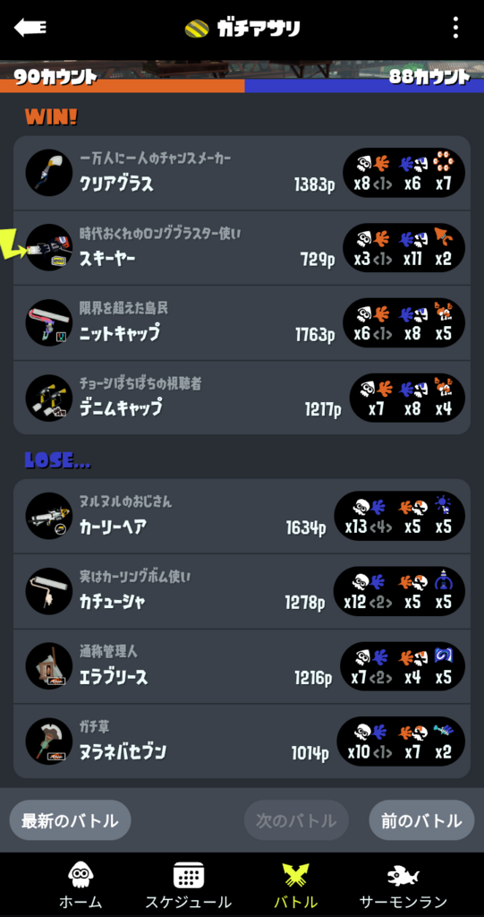 青バッジ目前で緊張のせいか急にXPが1000くらい下がったかのようなクソ雑魚ムーブをかましてしまったが、延長戦に入ってから50カウント差をひっくり返す奇跡の大逆転劇により9397位まで来た
