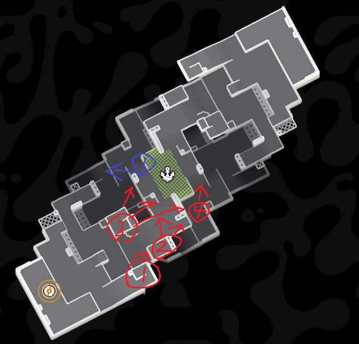 味方の典型的な動きは、前衛は赤②から正面張って、後衛は赤③に入るだろうから、自分が前衛なら赤④を担うのが理想?