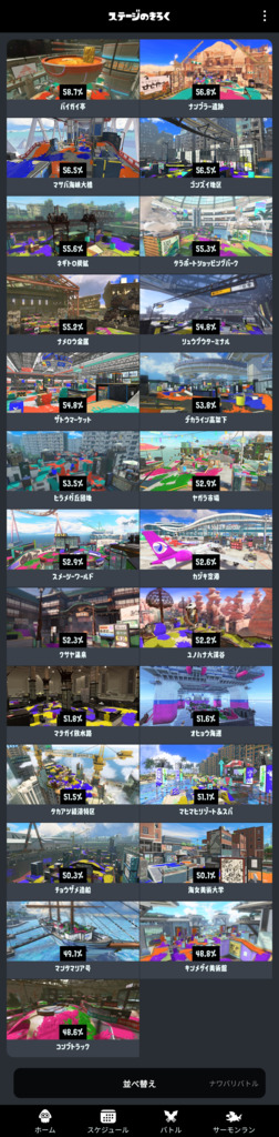 上でステージ勝率の話が出たから自分の見てたけど、全ルールで勝率50%超えてるのがスメーシーしかなかった ダイナモ持ちだから得意ステだと信じていたコンブはエリア以外50%割ってました…