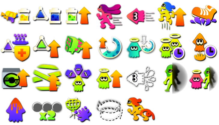 アイコン編集終了、背景白地でも見やすくなったでしょ 並べ終わってから影が少し気になったところは手直ししたからここには載せてないけど まぁこんな感じでってことでよろしく、差替えておくね あとwikiwiki運営から指摘があった画像の容量削減で他にも容量大きそうなのあったからそれも削減しておく (クマサン印シリーズのブキが256x256なのに270KBとかあるし)