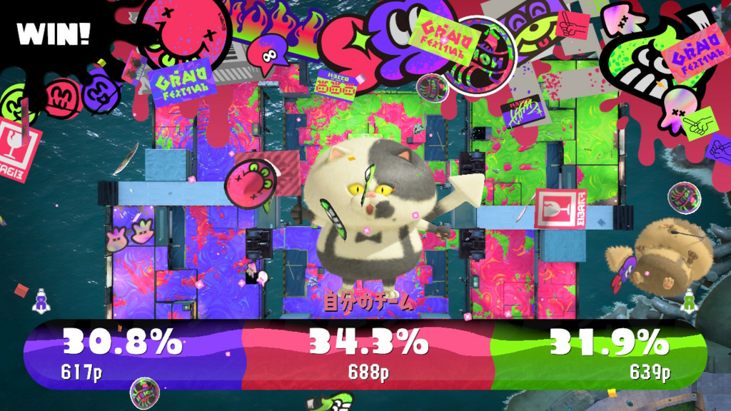ここは攻撃側2チームの理解が必要で、 相方チームを自陣高台に呼び込んで塗りを献上すれば一気に勝ちやすくなる 両者に理解がないと成立しないけど