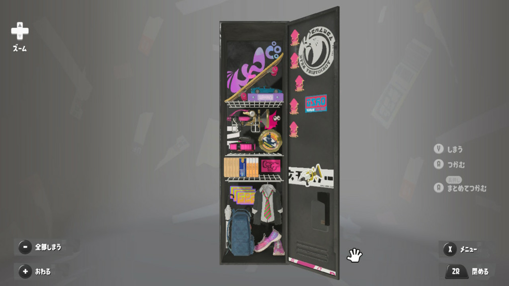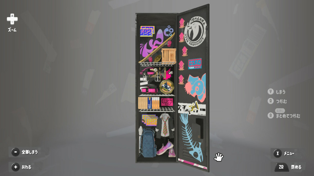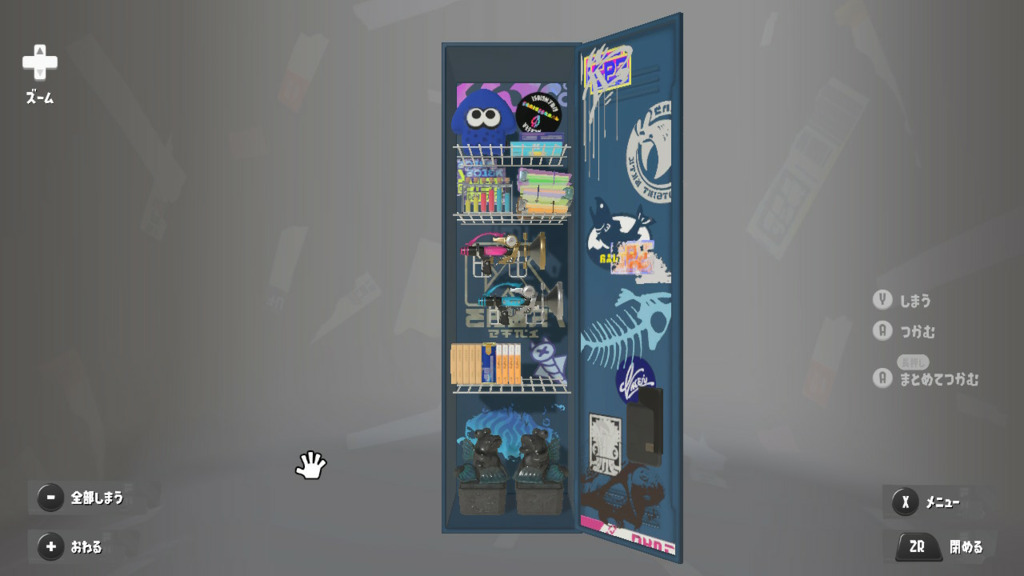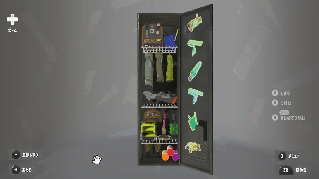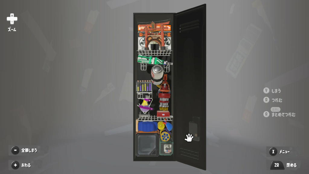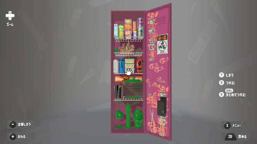 置物は基本的によく使うブキとかギアだけどムシャムシャスナックはマイイカが好きだから常備してる