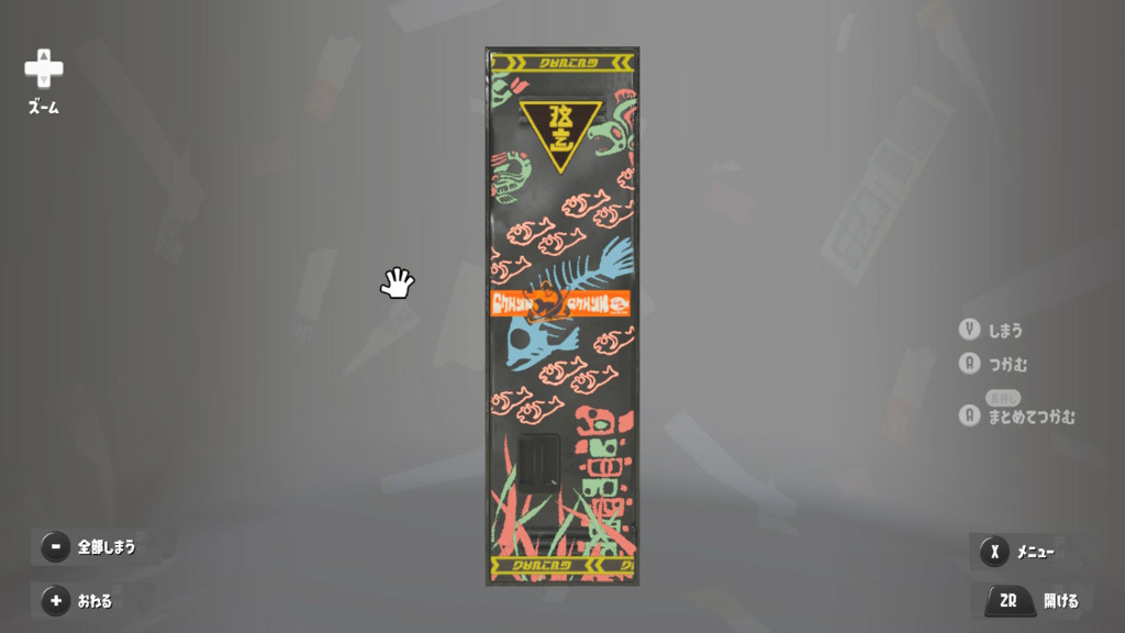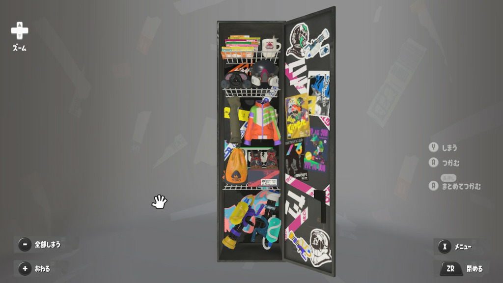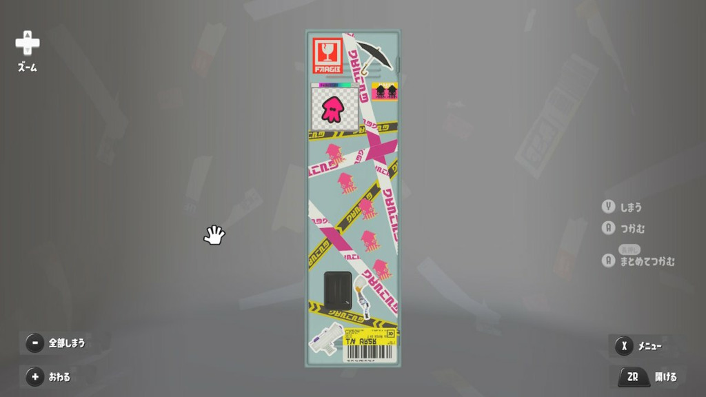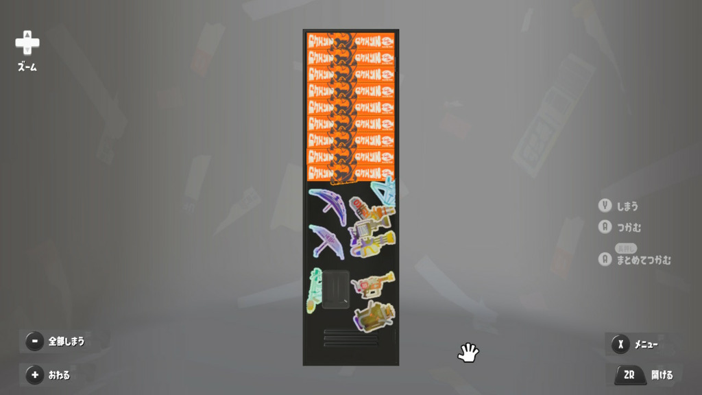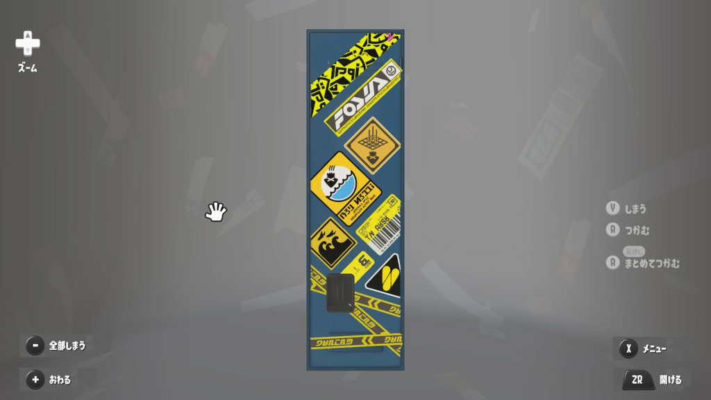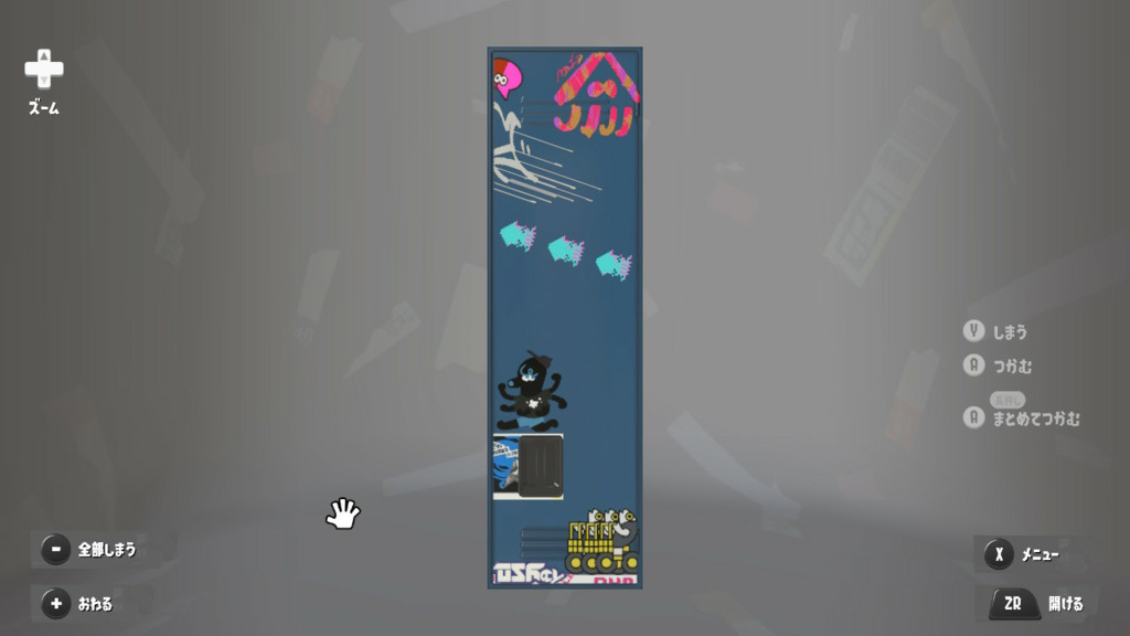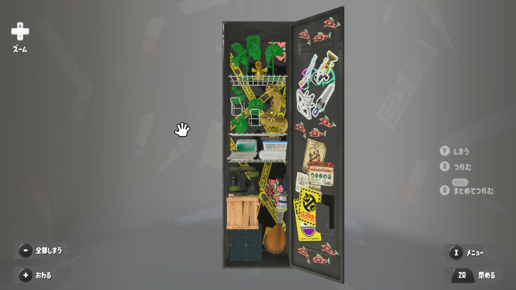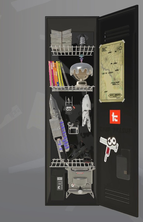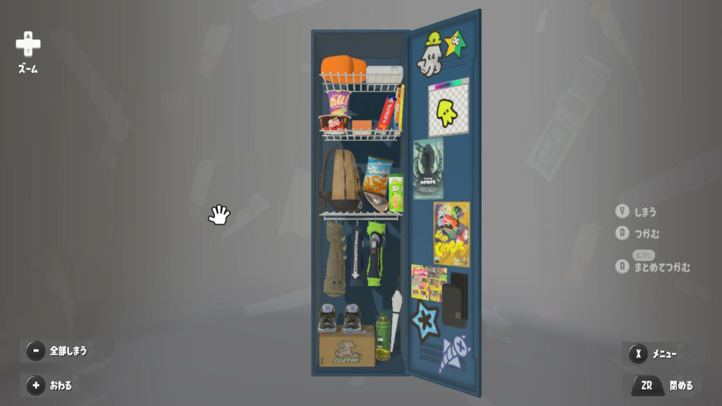 ステッカーは適当にべたべた貼ってるけどタラポートはよく行くからちゃんと貼ってるという設定 内面のステッカーは☆4取ったブキヴァリアブルもとってるけど貼り忘れた 置物は基本的によく使うブキとかギアだけどムシャムシャスナックはマイイカが好きだから常備してる