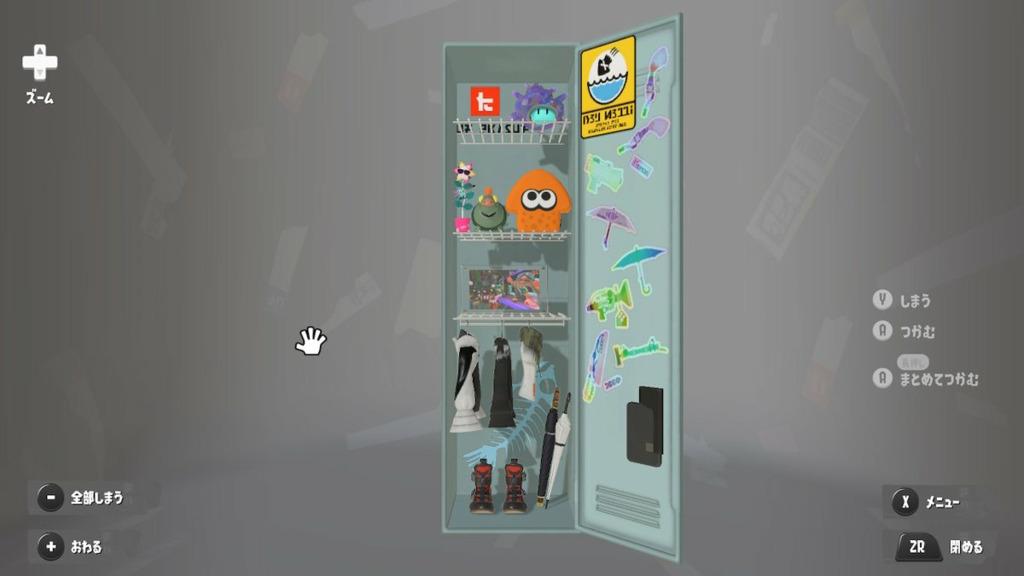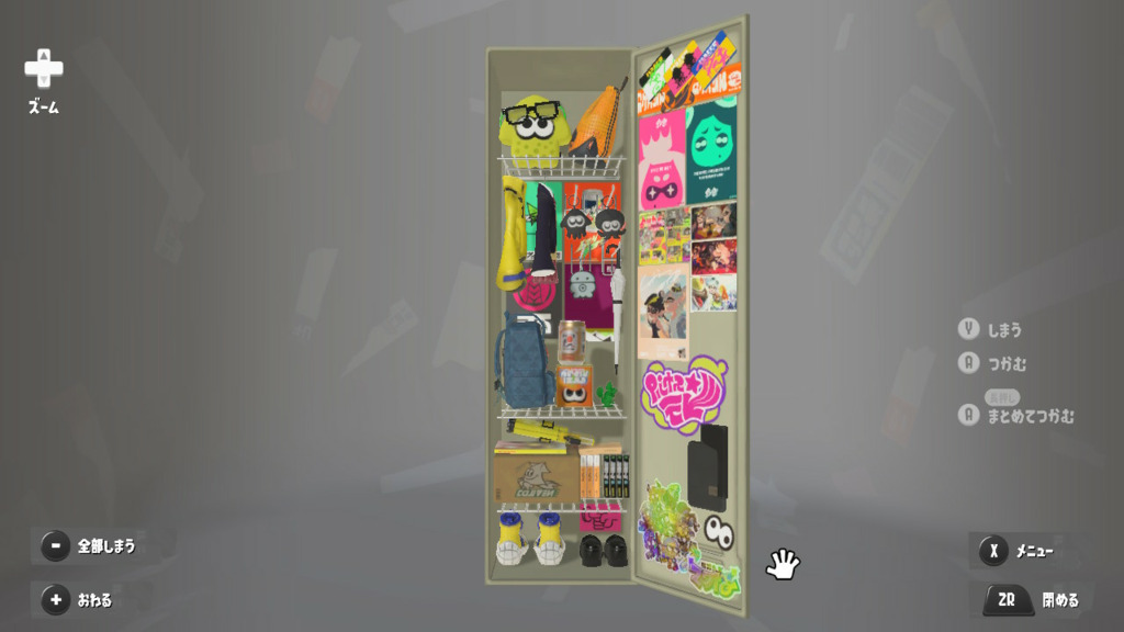 扉はイカのステッカー可愛いのでベタベタ貼ってるのと好きなブキ主張。 中身は本当に好きなもの詰め込んであるだけ。カセブカブーツ レッド最近あんまり履かないけど好きだからずっと飾っちゃってる。 ホロシールは最初持ってるだけ全部貼ってたけど貼る場所無くなってきたから好きなのだけに絞ることになっちゃった。もうちょっとスペース欲しい。