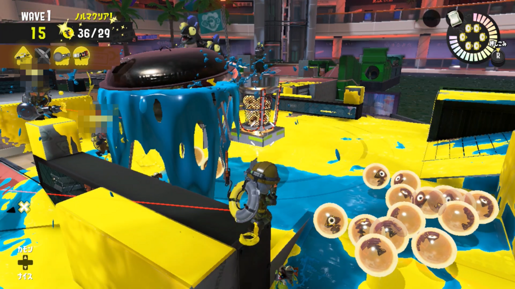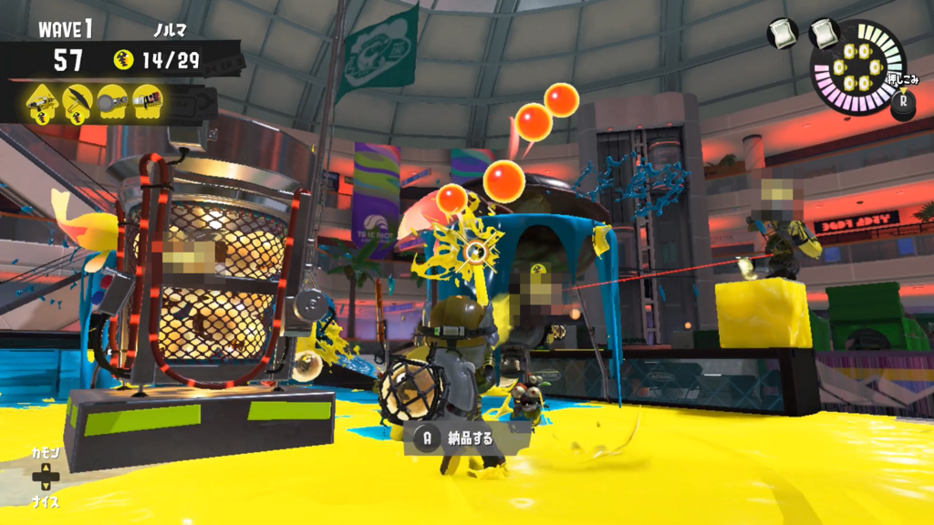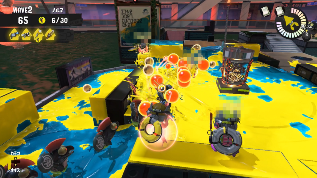 ラッシュも同様に上の安全地帯が使えるが、外周側の高台も安全。タゲられていない仲間がカゴ前のイクラを納品しやすくなる。