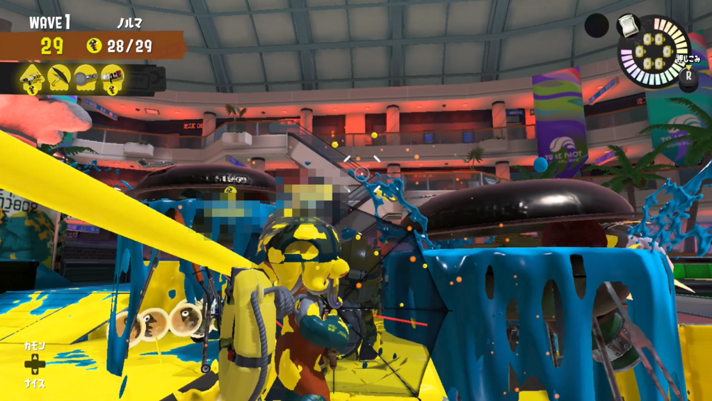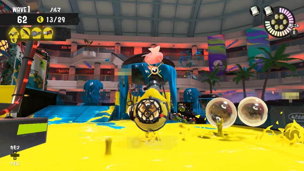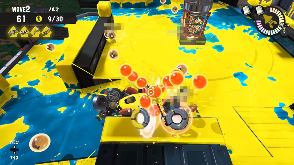 ラッシュも同様に上の安全地帯が使えるが、外周側の高台も安全。タゲられていない仲間がカゴ前のイクラを納品しやすくなる。 グリルにおいてはこのように弱点を向けることも