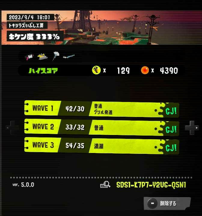 場所 トキシラズ キケン度:危険度333% バージョン:ver.5.0.0 16桁のコード:SDS1 K7P7 Y2UG Q5N1 支給ブキ4つ:.52ガロン、モップリン、フィンセント、スクイックリンα wave1 通常グリル wave2 通常 wave3 満潮