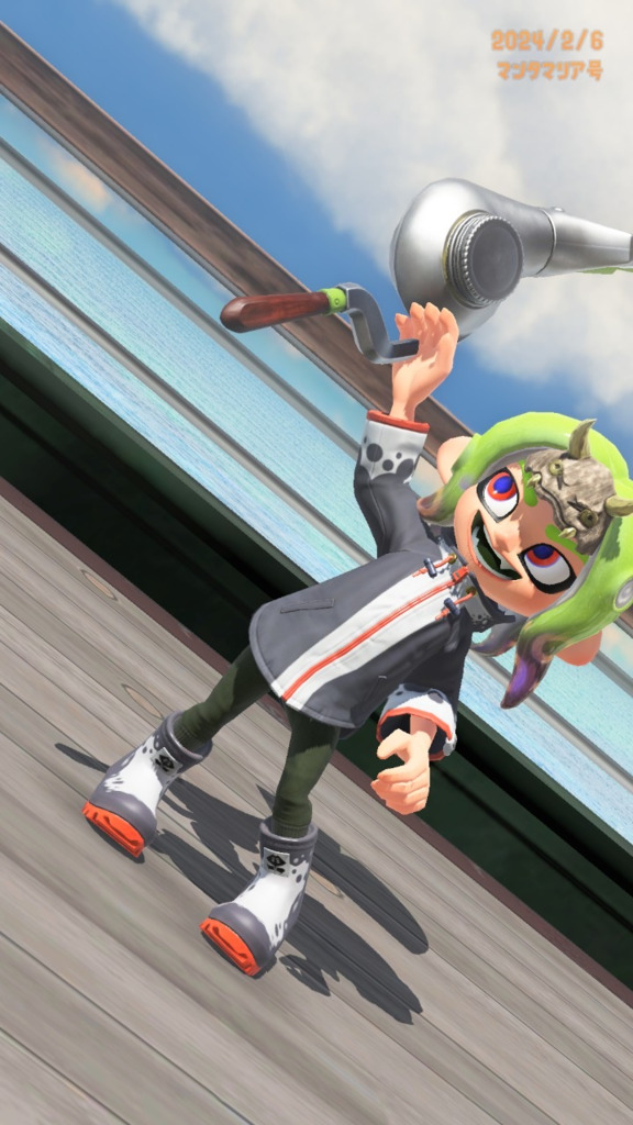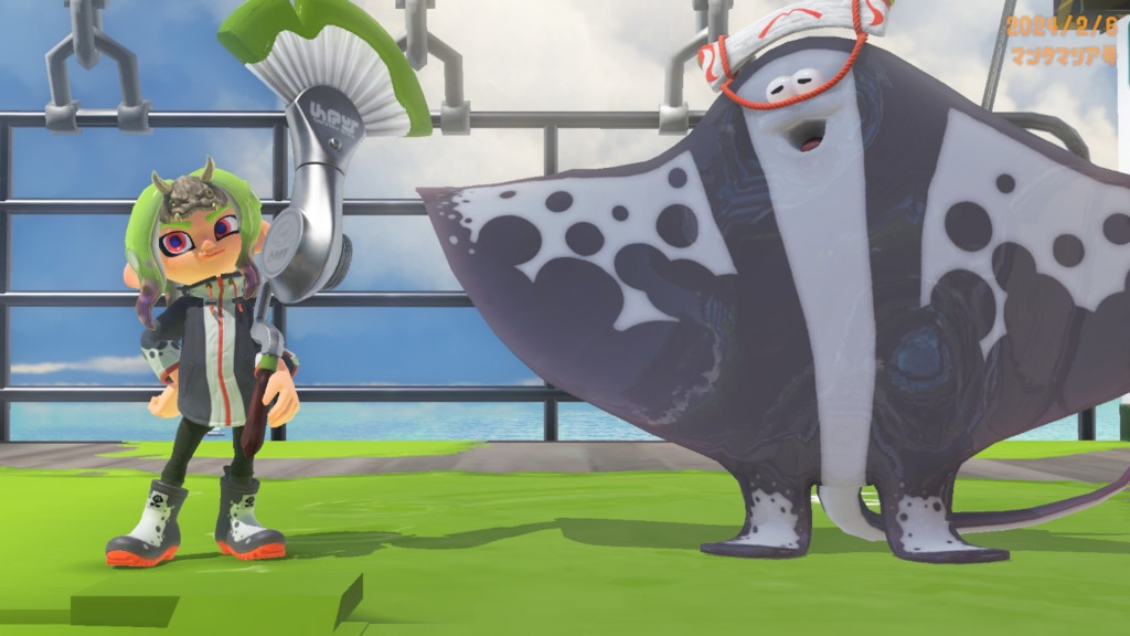 カラーリング同じだから実質マンタローだよ 🐙「マンタローサンヲ描イテミマシタ!」 マ「エイ……(これ僕?)」 記念撮影感 右のやつめっちゃポーズかわいない?ブキ持ってるポーズの中で1番好きまである