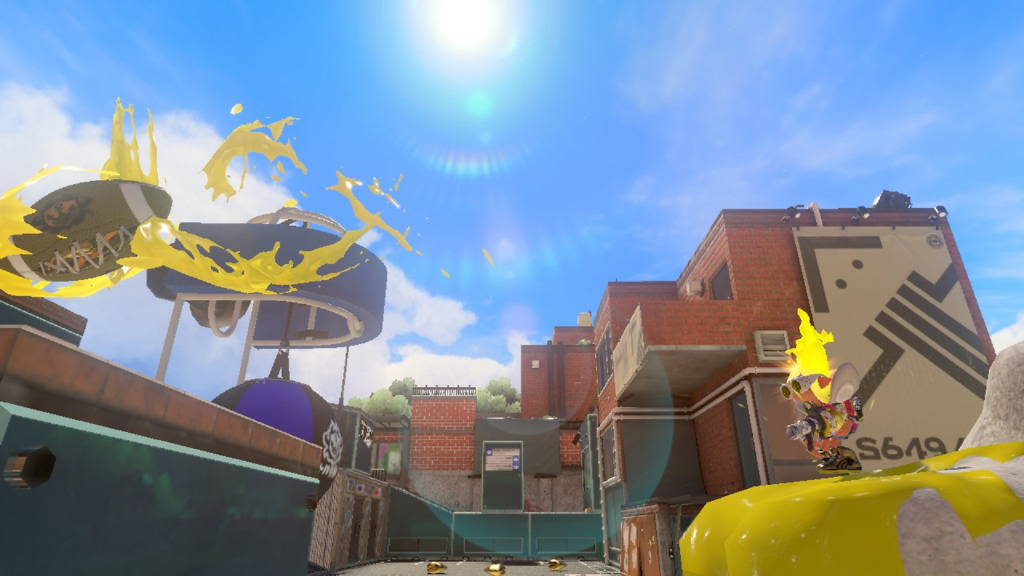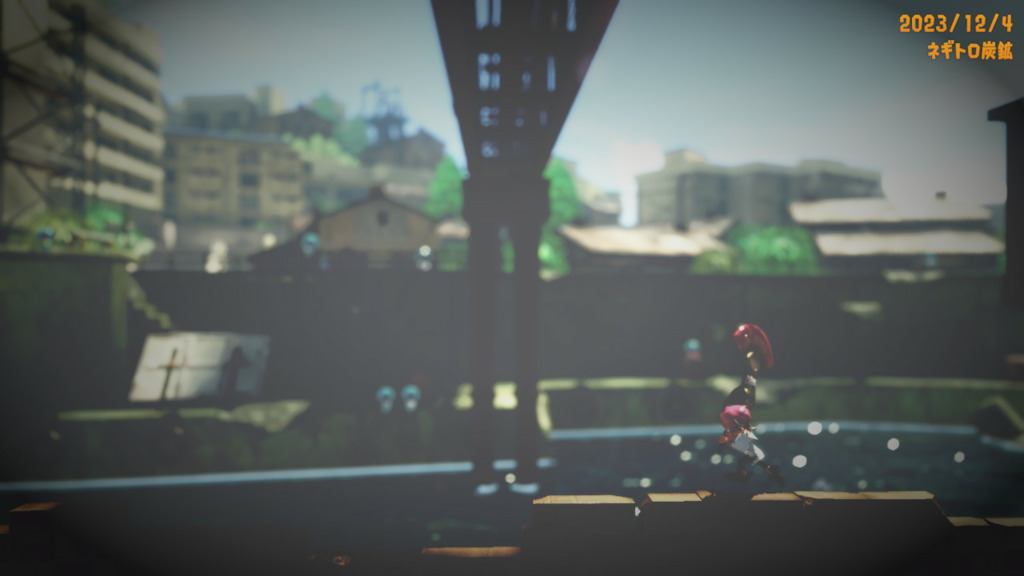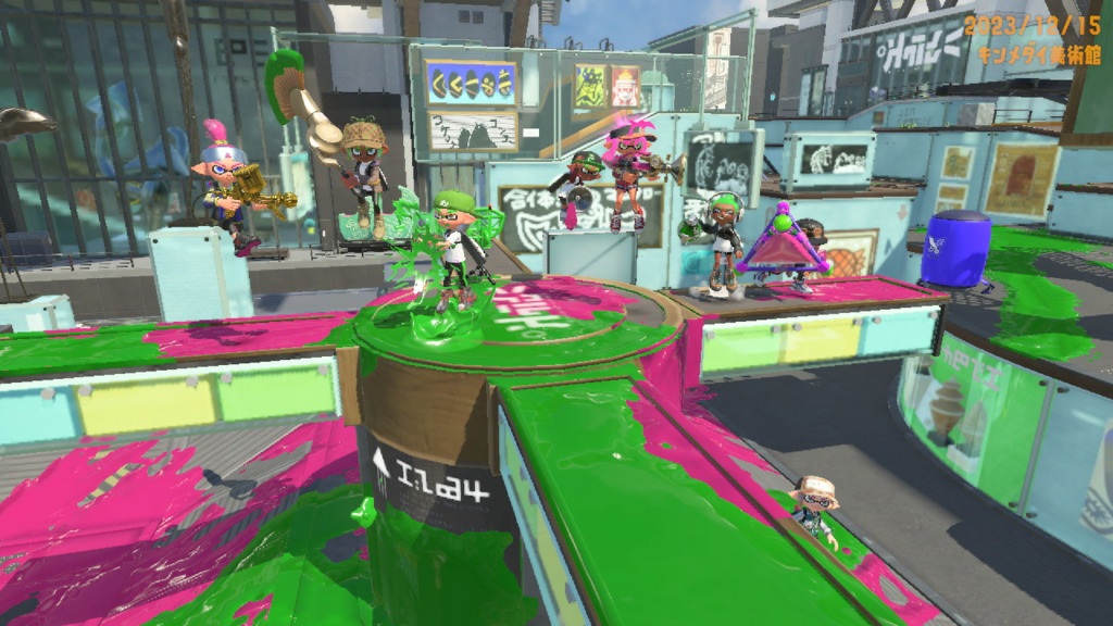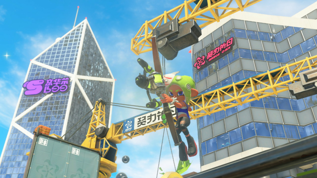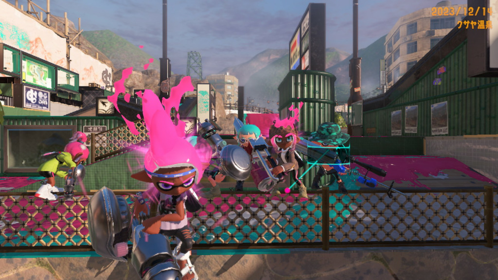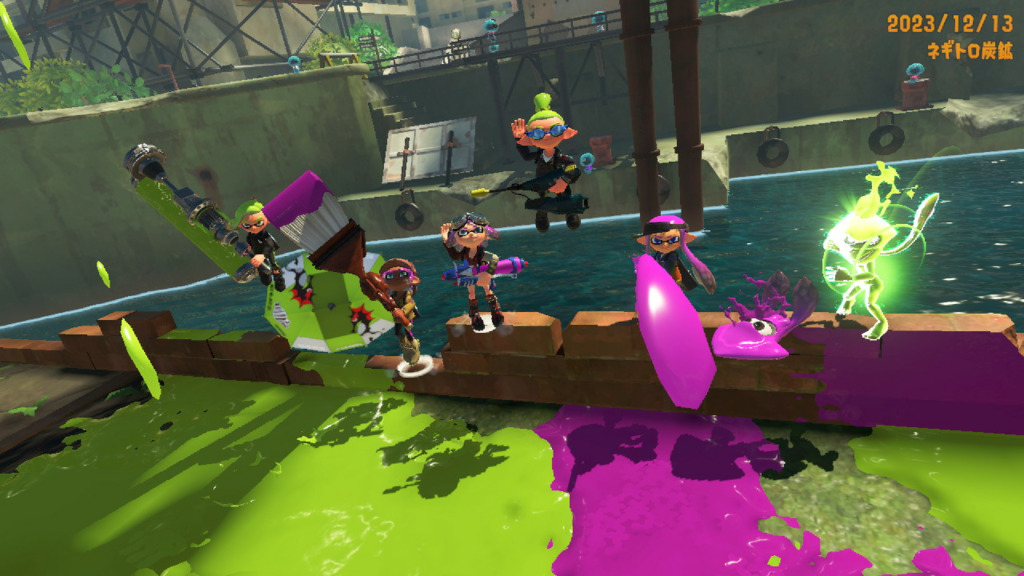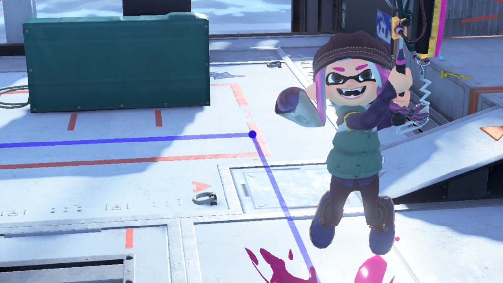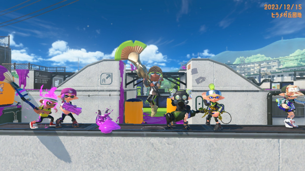 プレイヤーの視線に対してキャラクターの向きを少しずらした状態でジャンプし、着地すると同時にメインウェポンを使うことで、普段より躍動感のあるポーズを撮ることができます